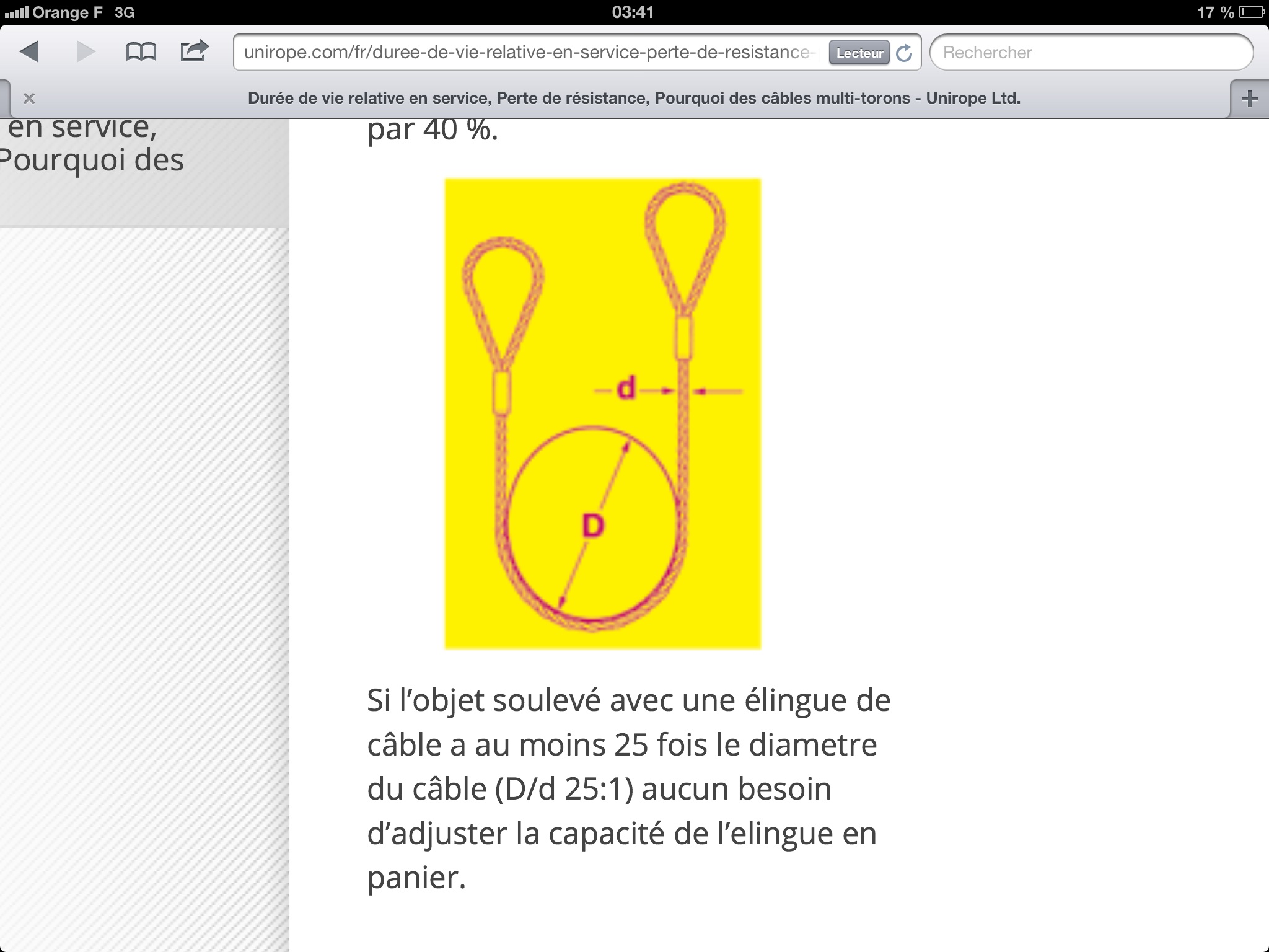 Si l’objet soulevé avec une élingue de câble a au moins 25 fois le diamètre du câble (D/d 25:1) aucun besoin d’ajuster la capacité de l’élingue en panier.