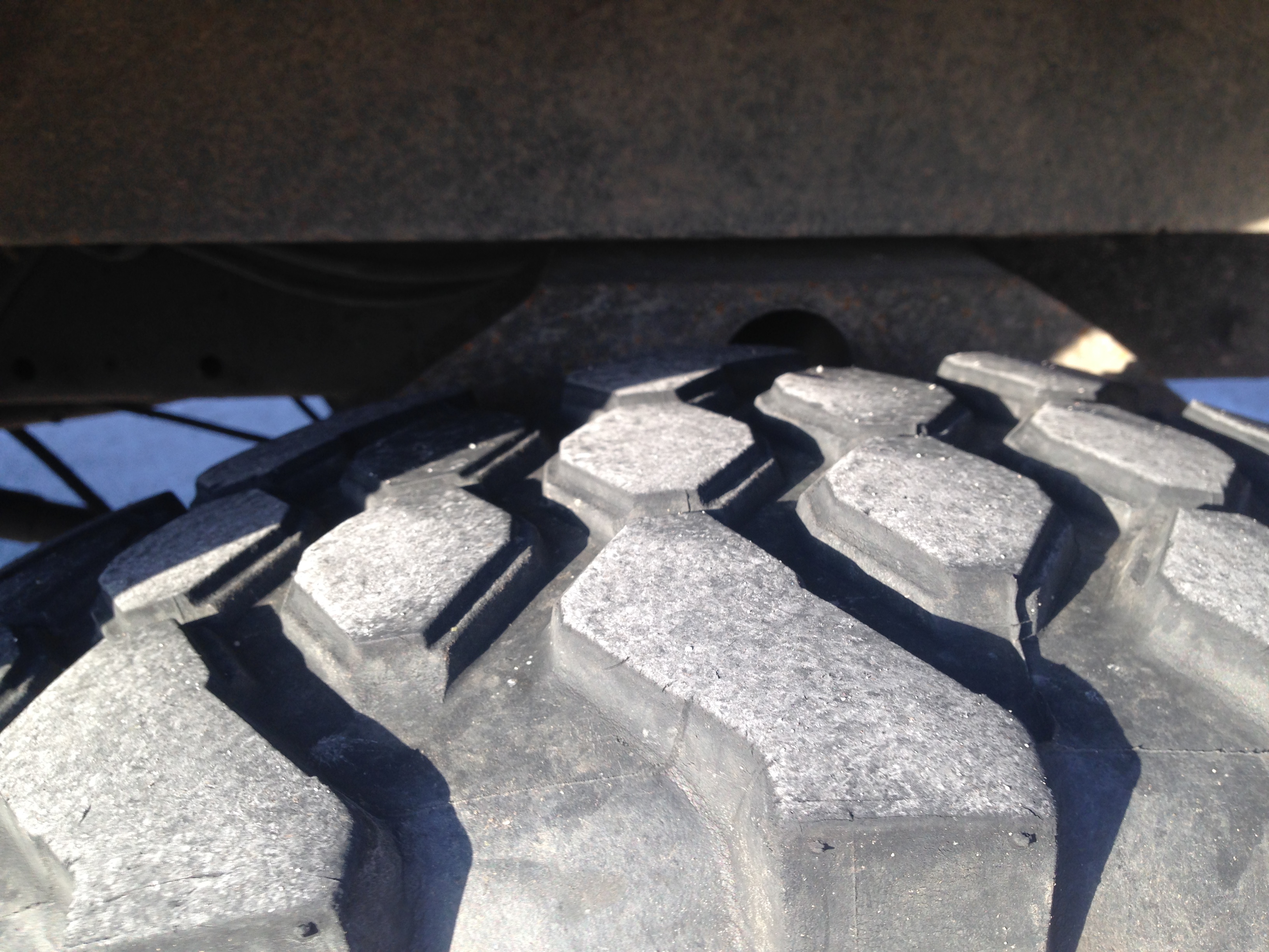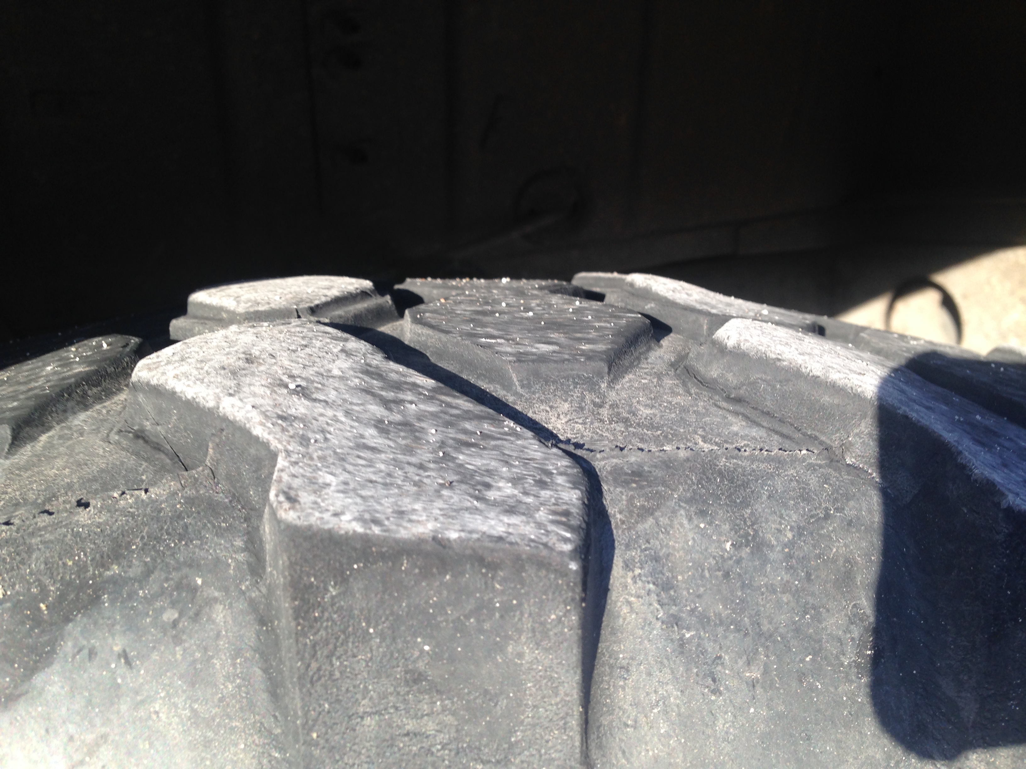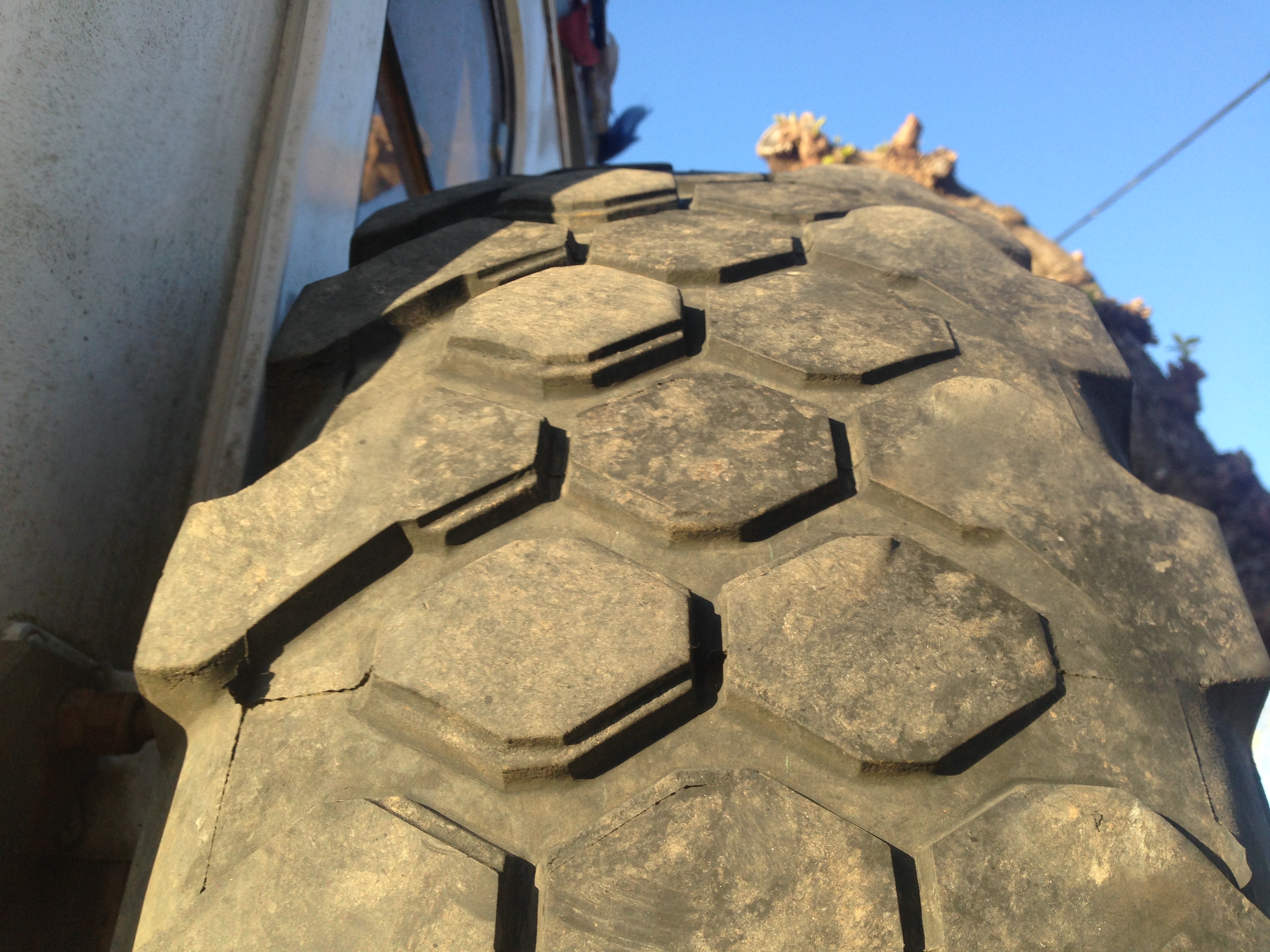 La roue de secour était à l'avant droit, il y à peu, et en remarquant ces bosses bizares qui n'étaient là que sur ce pneu, j'ai cru que c'était un défaut de moulage que je n'avait pas remarqué lors de la mise en place. Je l'ai donc échangé avec la roue de secour qui était nickel, et les autre pneu aussi.