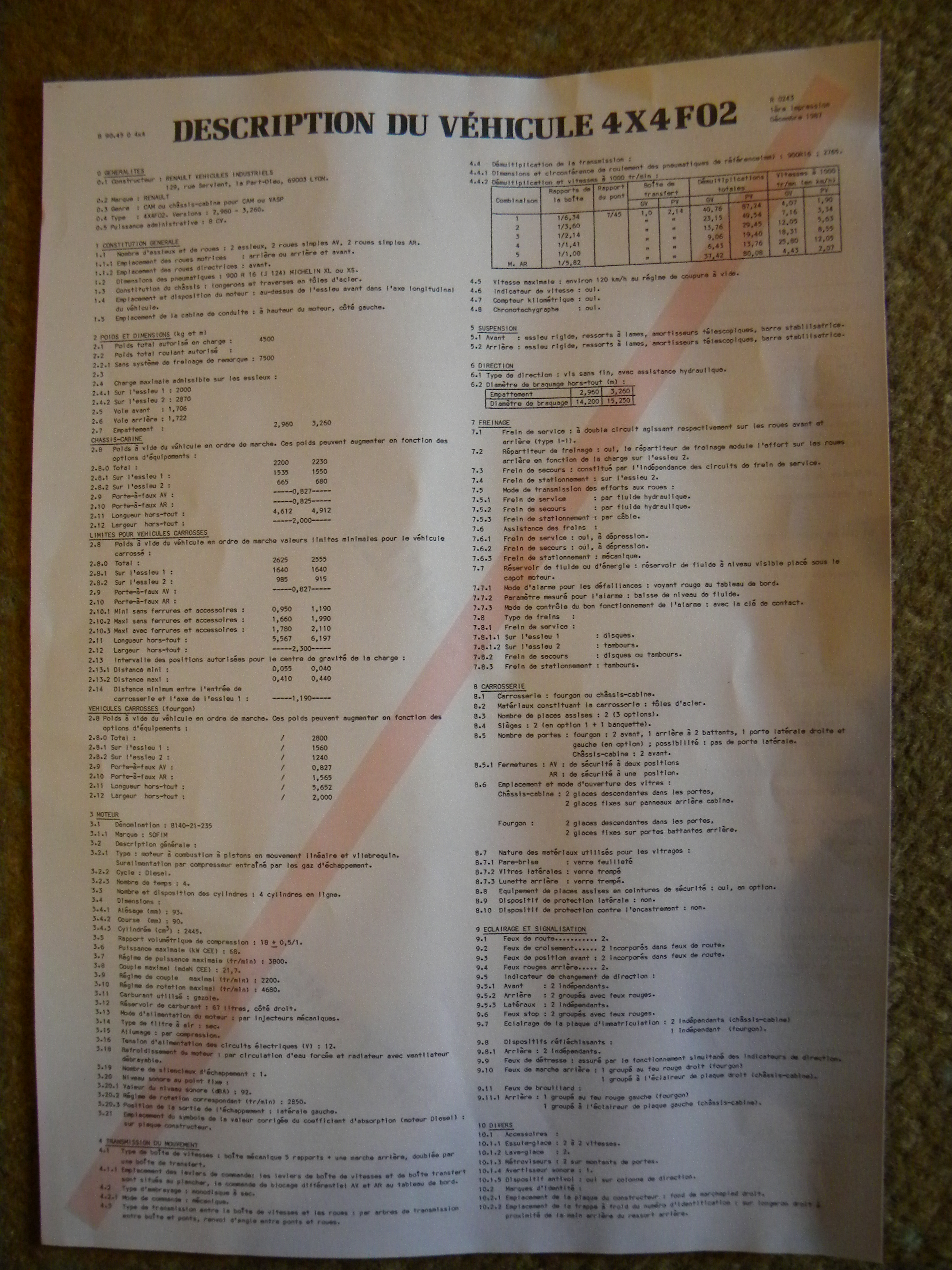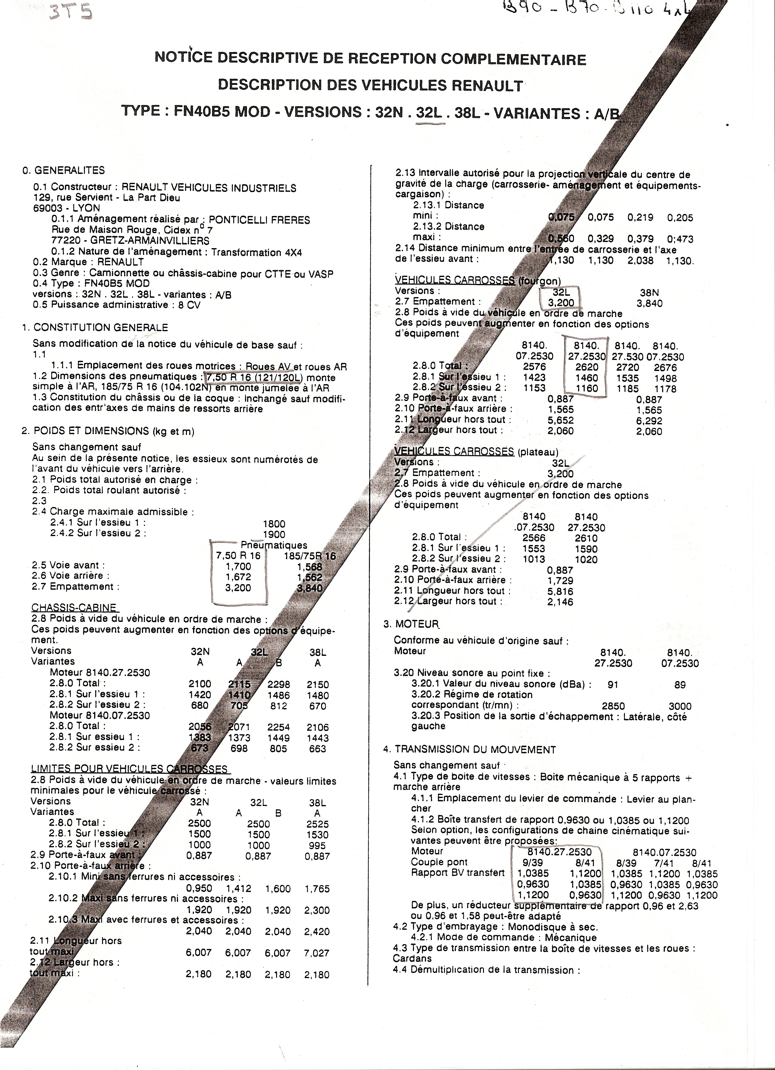 Les deux spécimens 3T5 et 4T5 concernant les Renault 4 x 2 tels qu'ils sortaient de chez Renault AVANT transformation en 4x4 par Ponticelli. Ces documents permettent de prouver que la structure du véhicule (faite par Renault) pouvait bien être immatriculé en 3 T 5 (FN 40 B5) ou en 4 T 5 (FN 40 A5), les deux versions 4 x 2 de base.