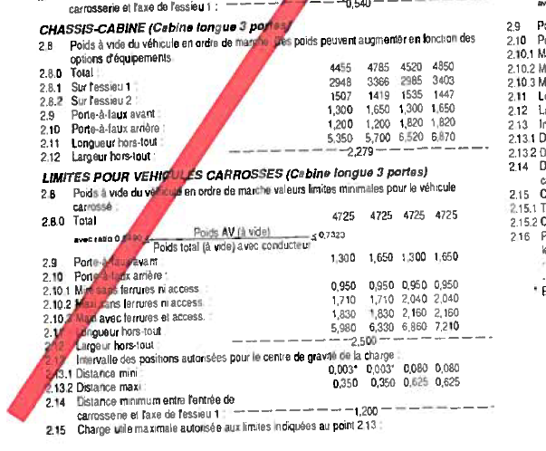 - le porte à faux qui varie suivant l'empattement et la cabine et le treuil(pour certains modèles) ou pas...