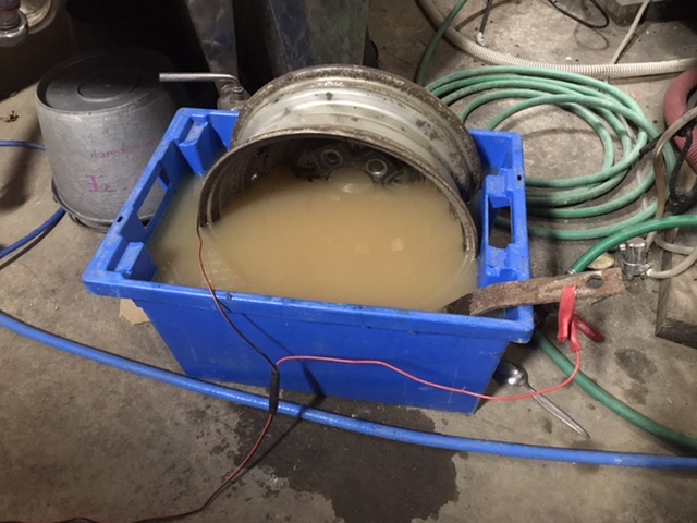 Sinon pour ton châssis , tu peux peut-être enlever la rouille par électrolyse : tu plonges ton châssis dans un bain d’eau, une cuillère à soupe de bicarbonate de soude par litre d’eau, tu branche le plus d’un chargeur de batterie à l’anode (une pièce métallique et le moins au châssis immergé totalement. Je suis en train de tester avec une jante... je vais le faire en deux fois, ma bassine est trop petite,