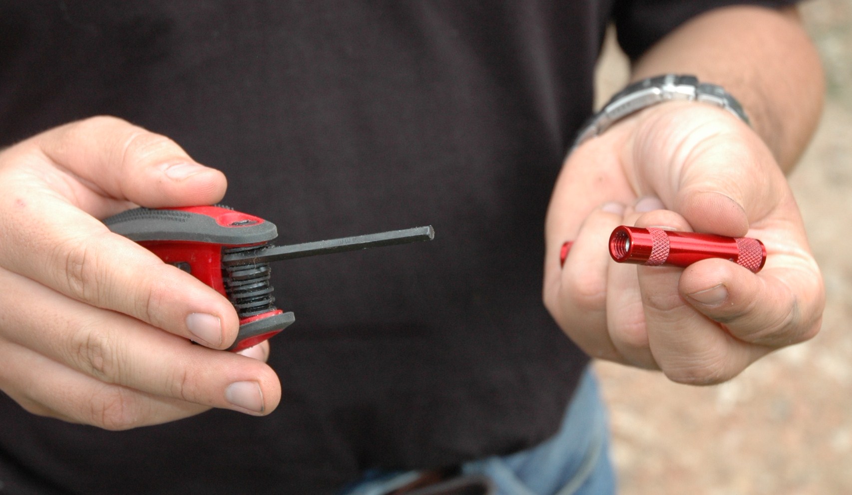 Puis nous rentrons véritablement dans le vif du sujet à savoir le réglage des dégonfleurs automatiques. Le principe de réglages est le même pour les deux types d’appareils à savoir une vis de précontrainte qu’il faut ajuster en fonction de la pression résiduelle de dégonflage choisie. Pour cela, il faut dans un premier temps serrer les vis de contraintes au maximum, à la main pour le modèle STAUN TYRE et avec une clé six pans pour le modèle TRAILHEAD. Après il faut descendre un pneumatique à la pression de dégonflage voulu, c’est à dire dans notre cas 0.9 kg. Pour cela utiliser un contrôleur de pression. Ensuite visser fermement un dégonfleur automatique sur la valve du pneu et desserrer sa vis de pré-contrainte jusqu’à ce que l’air commence à s’échapper. Stoppez alors le desserrage et resserrez très légèrement la vis. Pour contrôler la justesse du réglage regonflez votre pneumatique à une pression significativement supérieur (1.5 kg par exemple) et placez votre dégonfleur automatique de nouveau sur la valve et laissez le agir puis contrôlez une nouvelle fois la pression de votre pneu. Quelques ajustages peuvent nécessaire, procédez alors par tâtonnement et renouvelez l’opération autant de fois qu’il le faut pour arriver à un résultat précis. Une fois cette opération terminé, il ne vous reste plus qu’à recommencer pour les 3 frères jumeaux restant histoire de ne pas faire de jaloux.