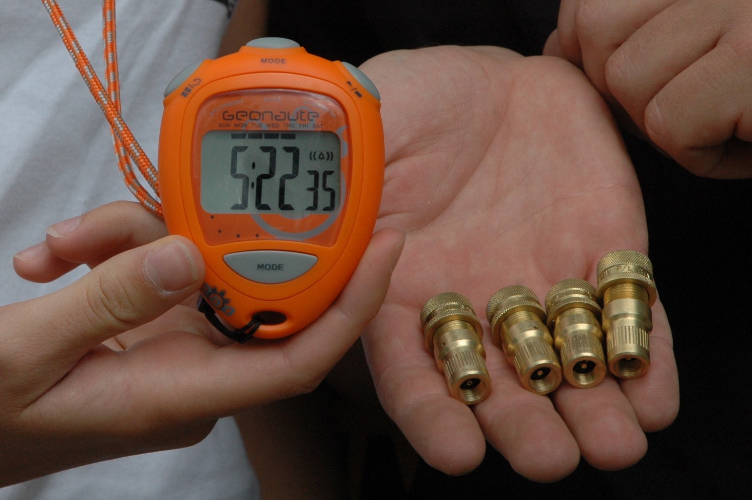 Premier essai avec le modèle STAUN TYRE, c’est parti, première roue, on retire le bouchon, on place le dégonfleur automatique et on enchaîne de même pour les trois autres roues et puis après quelques minutes de patience au fur et a mesure que les dégonfleurs automatiques s’arrêtent, on procède en sens inverse avant de remonter dans le véhicule ! STOP ! Résultat 5 mn et des brouettes pour ce premier essai pour descendre de 2.5 kg à 0.9kg.