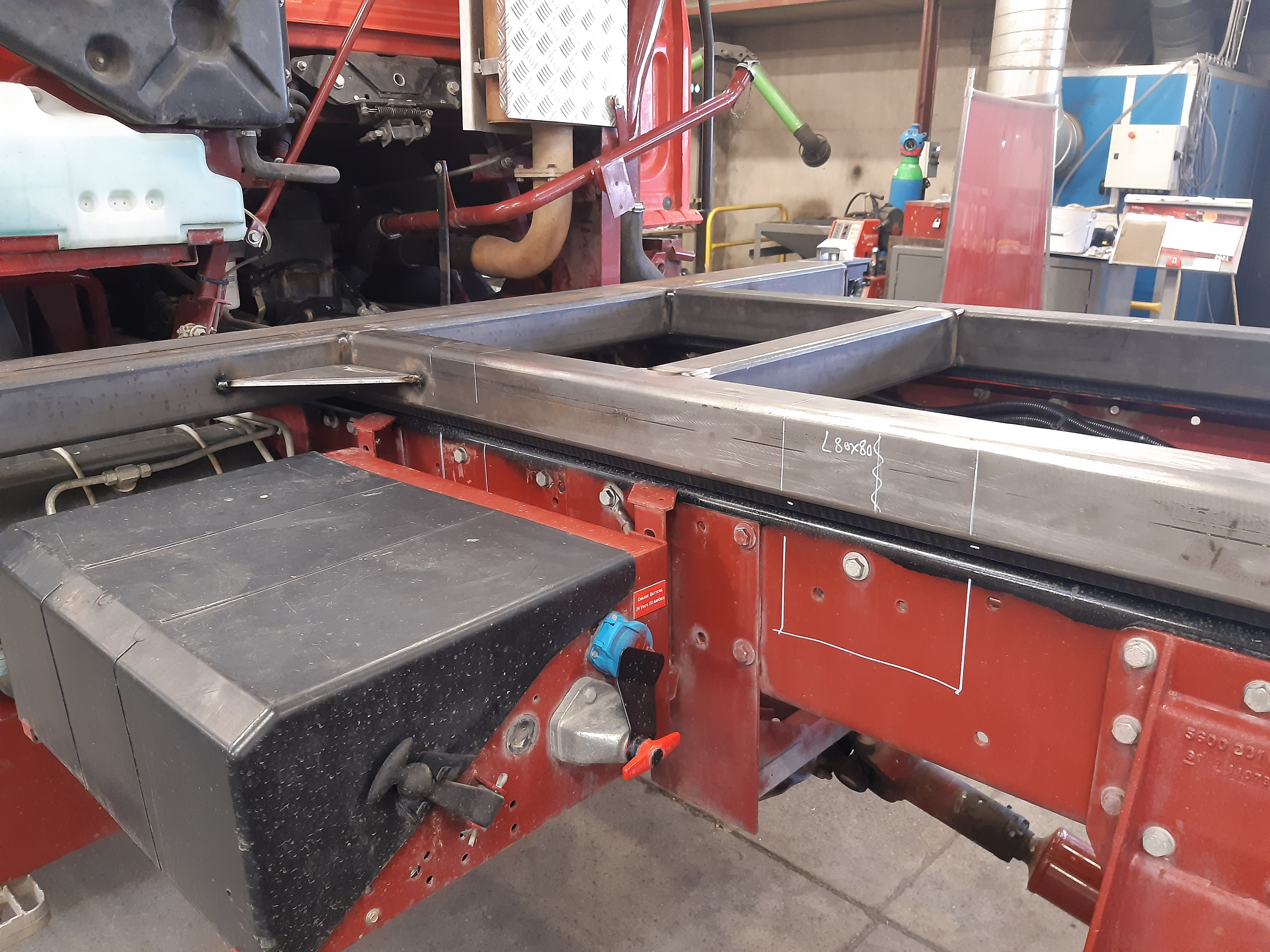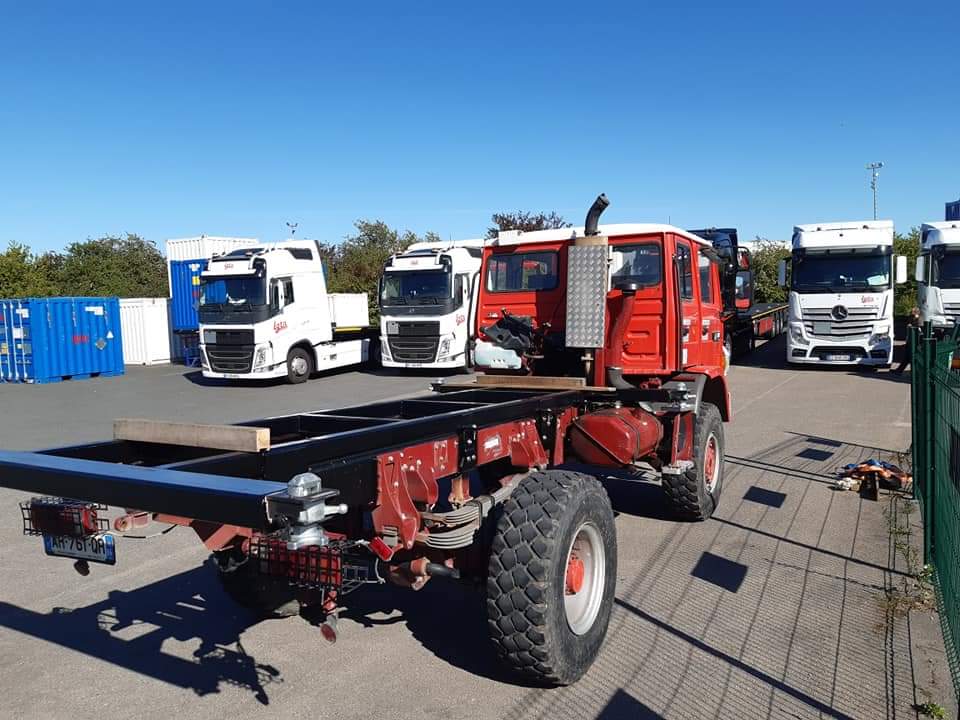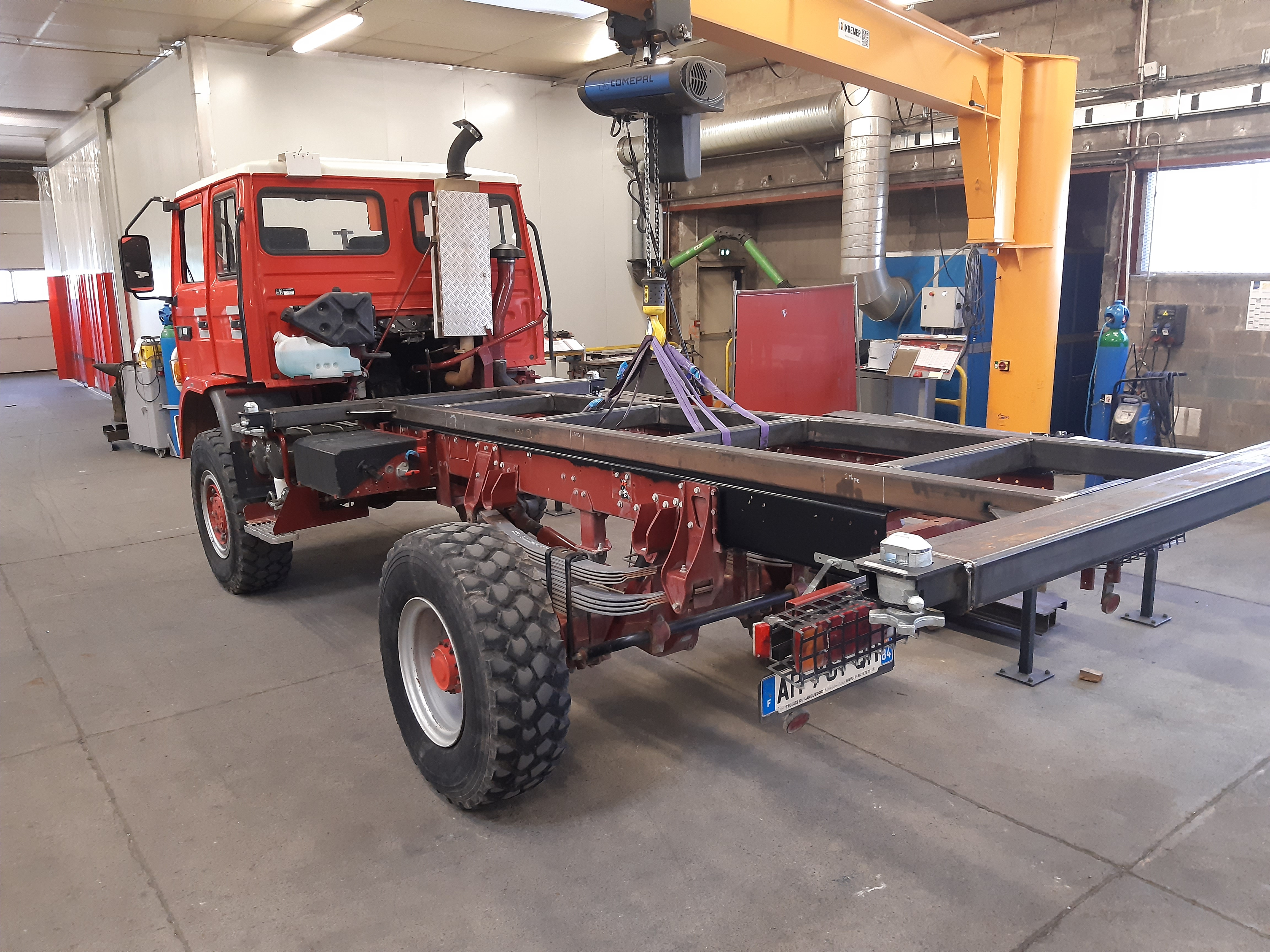 alors le truc, c'est que mon système n'est pas sur "pivot". Mon faux-châssis repose intégralement sur la longueur des longerons (châssis) et il est boulonné "fixe" à l'arrière sur les fixations d'origine de la plateforme qui servait de support pour la motopompe et le dévidoir. Après, sur la longueur en revenant vers la cabine, environ tous les 1m, j'ai fixé des platines (elles aussi boulonnées au châssis du porteur) qui font face à une platine "jumelle" soudée sur le faux-châssis et la liaison entre les 2 se fera par un grand axe sur lequel il y aura les ressorts compressifs.