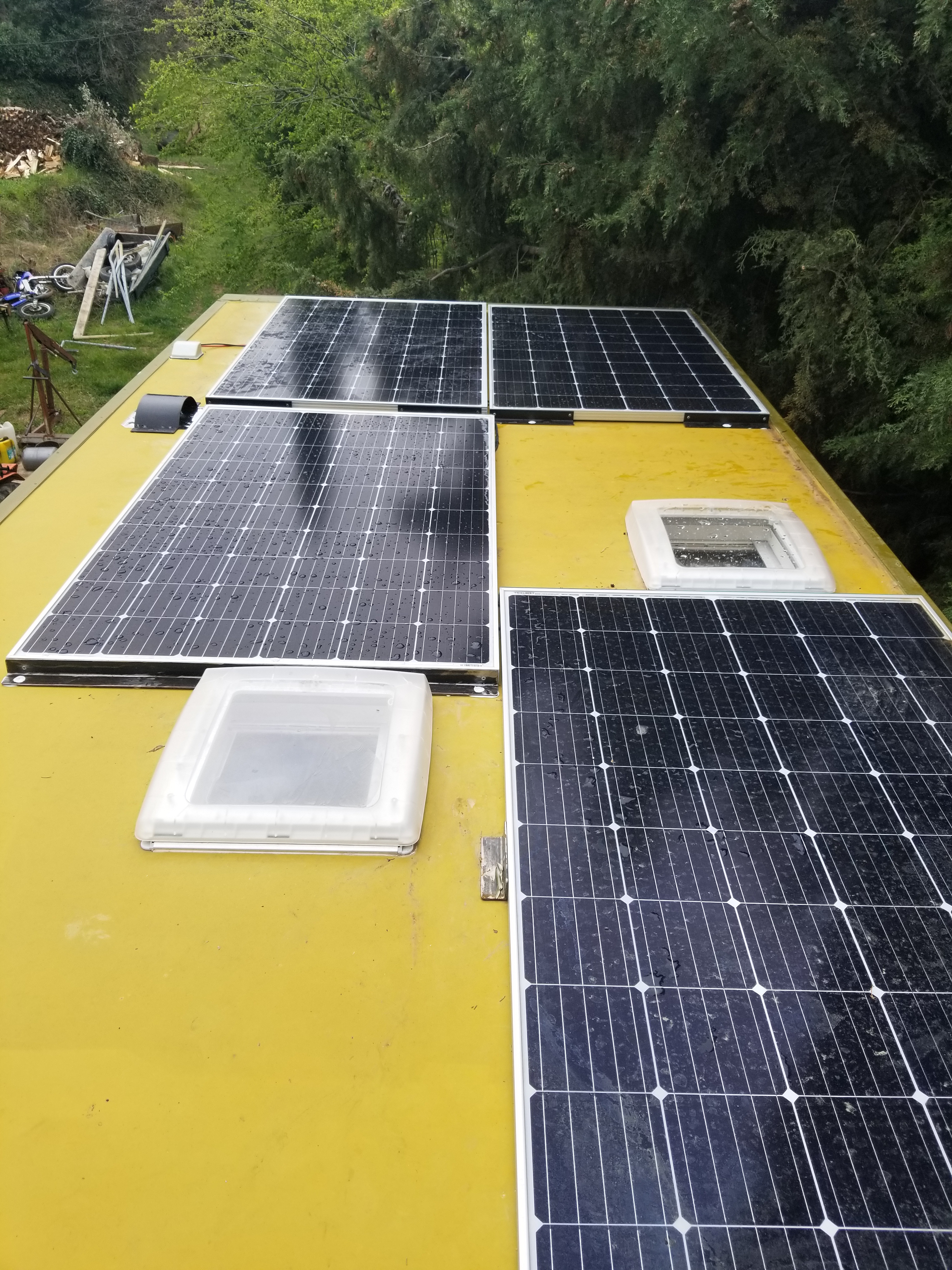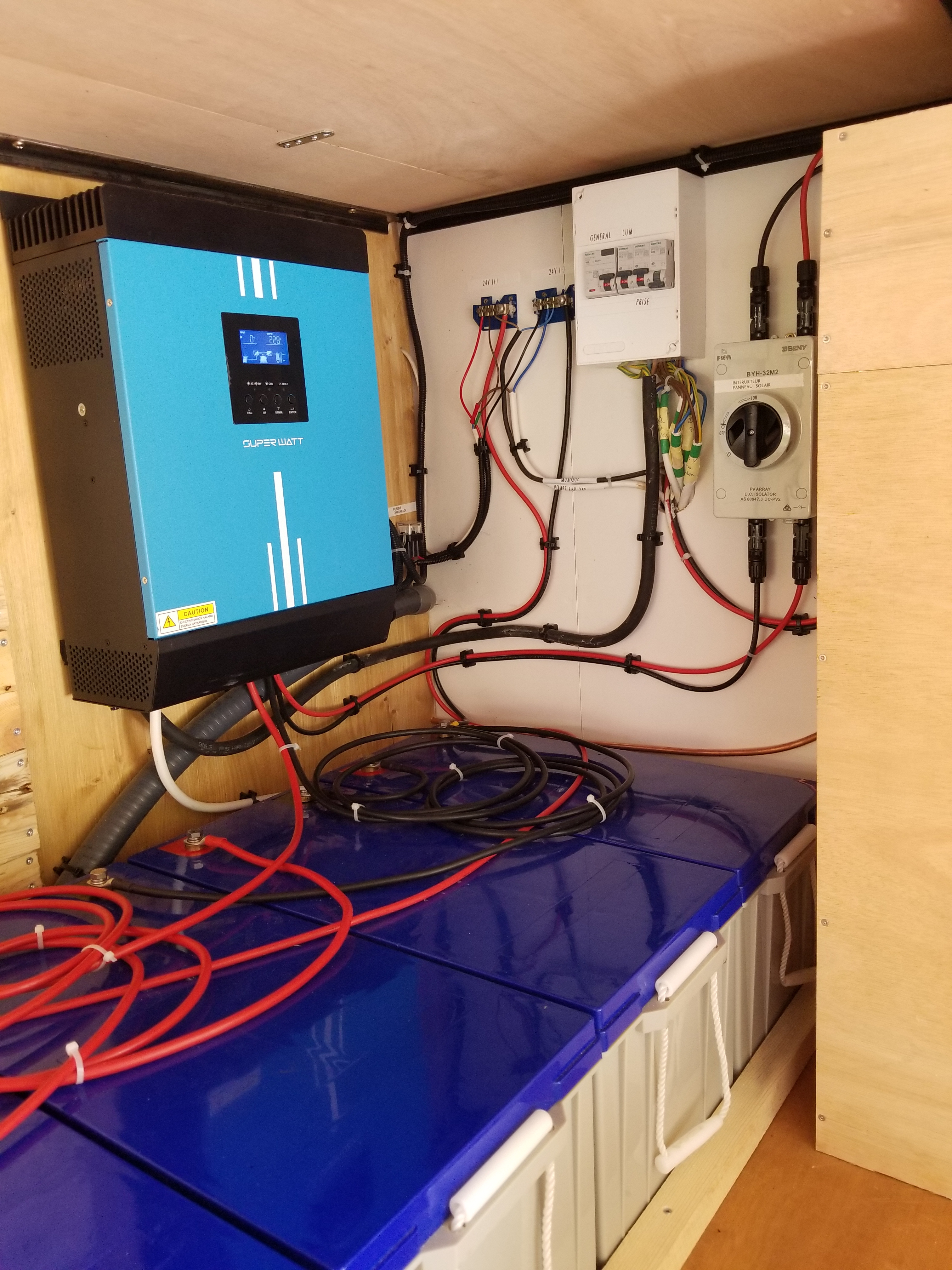 merci ! Alors pour la partie électrique, on a 4 panneaux 310W , 4 batteries gel 200Ah chacune et on a choisit d'essayer un onduleur hybride car vraiment abordable, celui la fait convertisseur 3500w, chargeur 24v et régulateur de charge MPPT en un seul boitier. On n'a trouvé que très peu de retours sur ce produit on va donc se faire notre propre idée. Ca fait un mois que tout est branché et pour l'instant rien à redire.