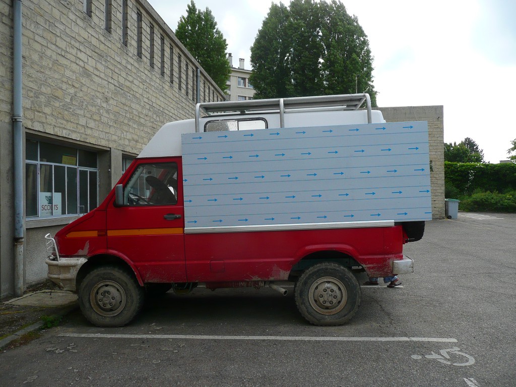 par ailleurs sur l'iveco j'ai solidarisé les portes comme je l'évoquais mais pour obtenir un hayon s'ouvrant vers le bas, offrant cette fois non pas un toit, mais un plancher... le soucis étant sensiblement le même: refermer le reste de la boite, même si l'iveco est beaucoup moins galbé que le t4.