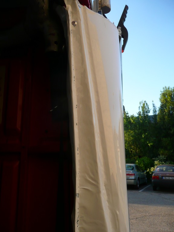 et bien il se trouve que l'endroit le plus large a l'extérieur n'est pas le plus large a l'intérieur car cette zone étant basse et exposée aux impacts éventuels : elle est caissonées...donc moins de place en largeur a cet endroit.