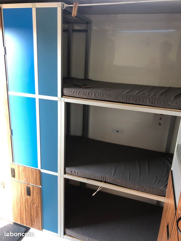Il s’agit d’une cellule créée par Modulidéa en Italie. Elle dispose de 7 couchages (3 enfants – 4 adultes) dont 5 couchages permanents ! Le faux châssis est intégré dans le plancher ce qui permet de gagner en hauteur, et le toit relevable donne accès à un grand couchage double à l’étage (200x160 !). La cellule est extrêmement bien isolée (nous n’avons jamais eu froid, même en hiver à Ushuaïa …). Et cela permet également d’être très bien protégés de la chaleur. Il y a beaucoup de rangements. Et la cellule est très lumineuse (3 fenêtres dont 2 très grandes) et donne une impression d’espace. La cellule dispose d’un chauffage Eberspächer avec thermostat d’ambiance, et d’un ballon d’eau chaude de 10 litres. La gazinière CAN FN1332 est neuve. Le frigo électrique (tiroir) de 40 litres fonctionne parfaitement. Il y a des toilettes sèches et une douchette extérieure avec eau chaude. La pompe à eau est électrique et il y a également un convertisseur Victron Phoenix 12/220V et un chargeur 220V Ctek. Un panneau solaire mobile Sunpower de 100W permet de stationner le véhicule à l’ombre et de placer le panneau solaire au soleil. Il y a un réservoir d’eau propre de 150 litres ainsi que deux réservoirs d’eaux usées de 12 litres chacun. Il est aussi possible d’évacuer directement vers l’extérieur lorsqu’il s’agit juste d’eau de rinçage … Nombreuses prises USB et une prise allume cigare. A l’extérieur deux rails Aéro ont été installés sur la face arrière de la cellule afin de pouvoir fixer par exemple un porte vélo. La cellule peut-être déposée par une personne seule grâce à 4 béquilles.
