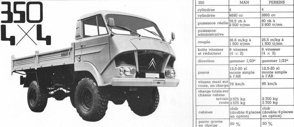 C’est au salon de l’automobile de 1968 que « CITROËN – SINPAR » présenta un châssis avec benne 4X4 CITROEN 350 avec 3 motorisations possibles :