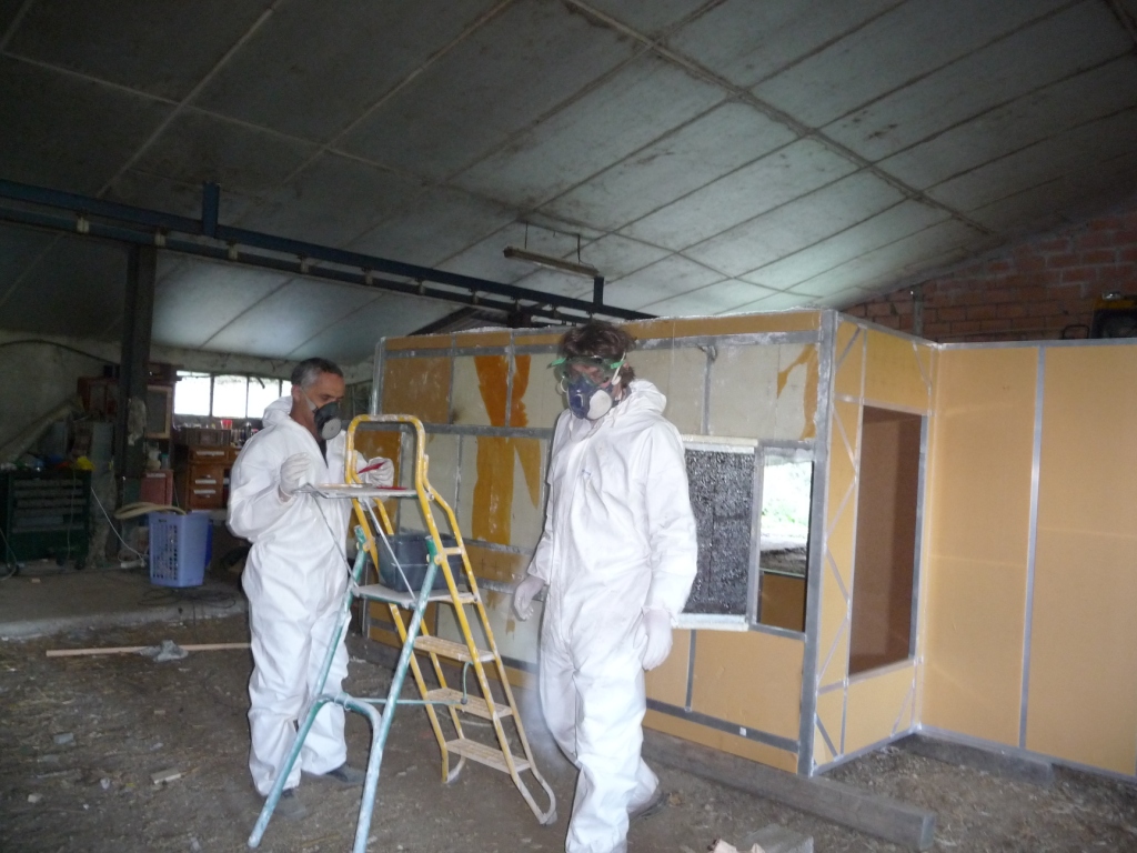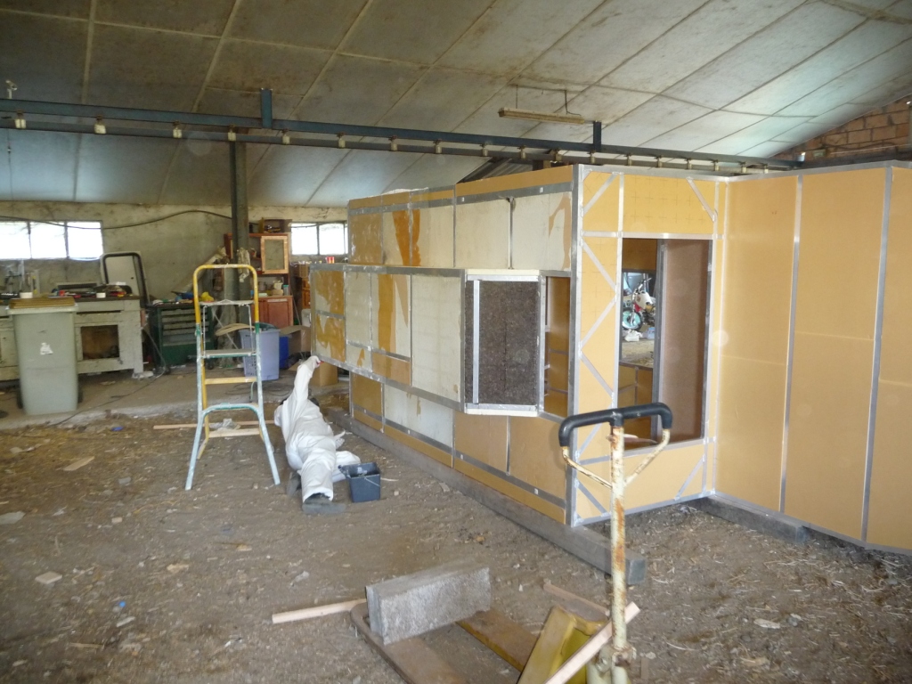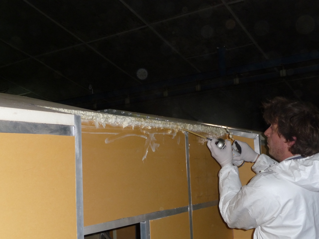 Découpe ajustage et collage des panneaux de mousse polyuréthane dans la structure en aluminium.