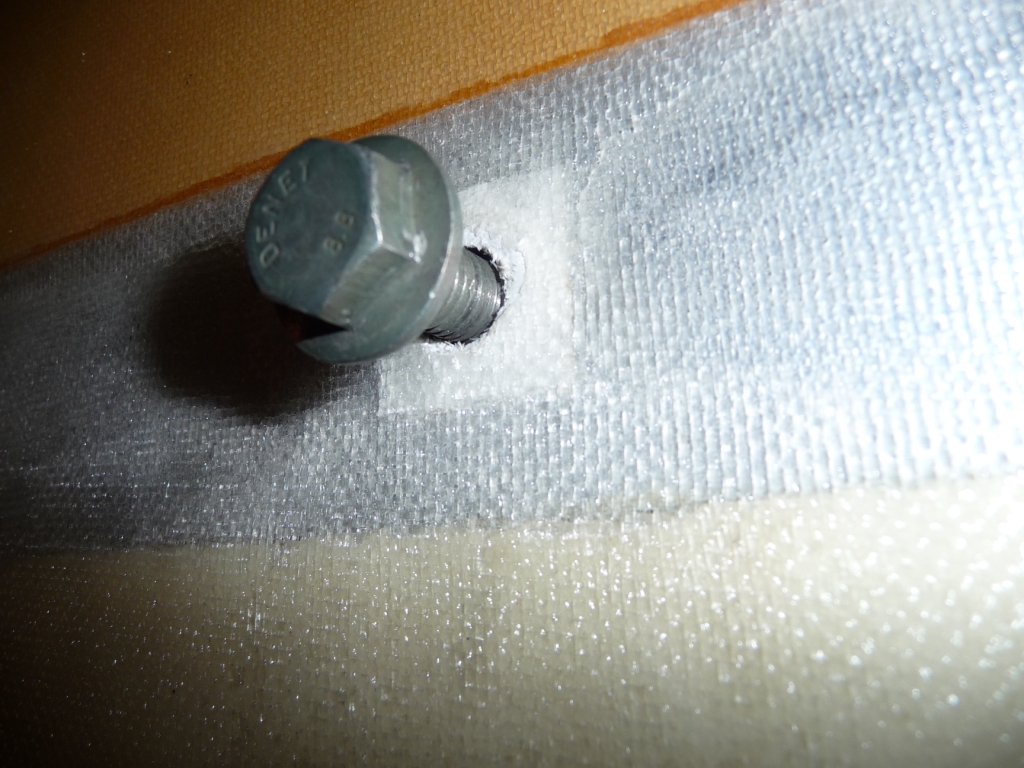 J’ai utilisé de la mousse PU de 30 mm destinée à l’isolation des planchers béton, dans ce cas un papier pare-vapeur est collé sur chacune des faces, je l’ai conservé. La mousse existe aussi en panneaux. La résine époxy est posée directement en stratification (résine + tissu) sur la mousse, elle est collée à la fois sur la mousse et sur la structure et participe à la rigidité de l’ensemble.