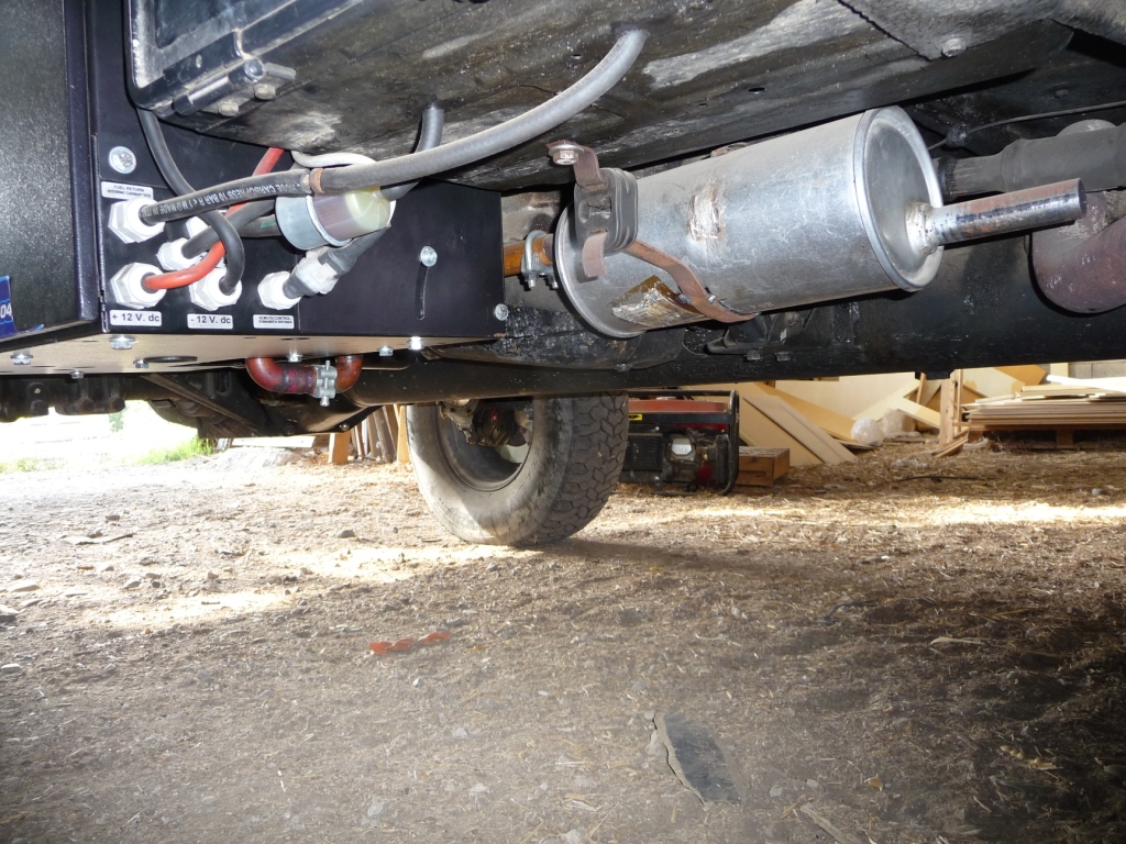Et je fais le pari que la légèreté de la cellule (prévision de +/-500 kg avec les pleins d'eau), une bonne répartition des masses (le groupe électrogène et les batteries sont positionnés au niveau du châssis, les reservoirs sont le plus bas possible et cloisonnés via des vannes permettant d'interdire la descente de l'eau vers le réservoir le plus bas en tout terrain) et un élargissement des voies du véhicule de 30 mm par roues permettrons d'éviter plus facilement des incidents plus graves. Je prévois simplement de réaliser un par-choc arrière protégeant bien la cellule.