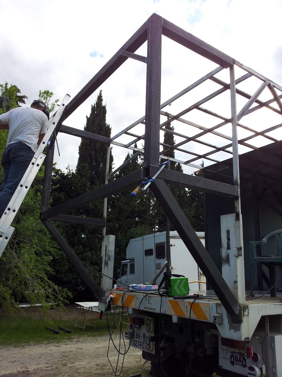 demain on reprend les soudures pour le squelette et j espère avoir le temps de toler le toit allé en revant un peu j espre pouvoir toler aussi le devant ^^