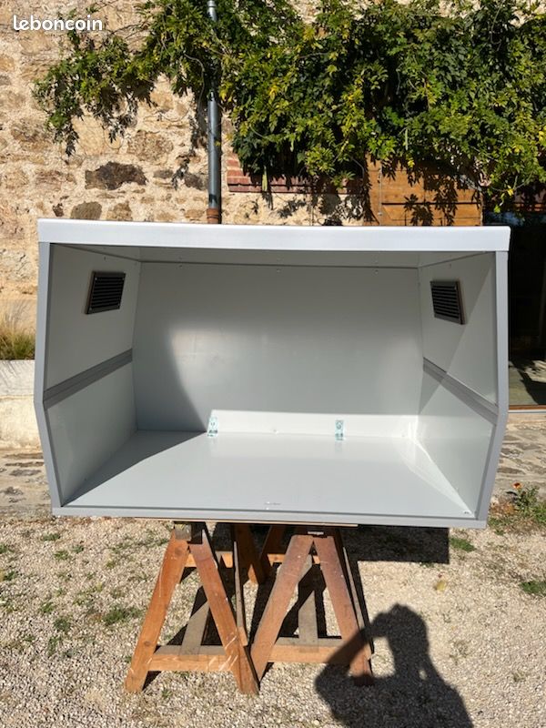 volume et portes de soute réalisé en panneau sandwich d'épaisseur 25 mm composés de mousse polyuréthane revêtue sur ses 2 faces de PVC gris clair. Les angles de ce volume sont renforcés par des cornières larges et épaisses en PVC gris sombre.