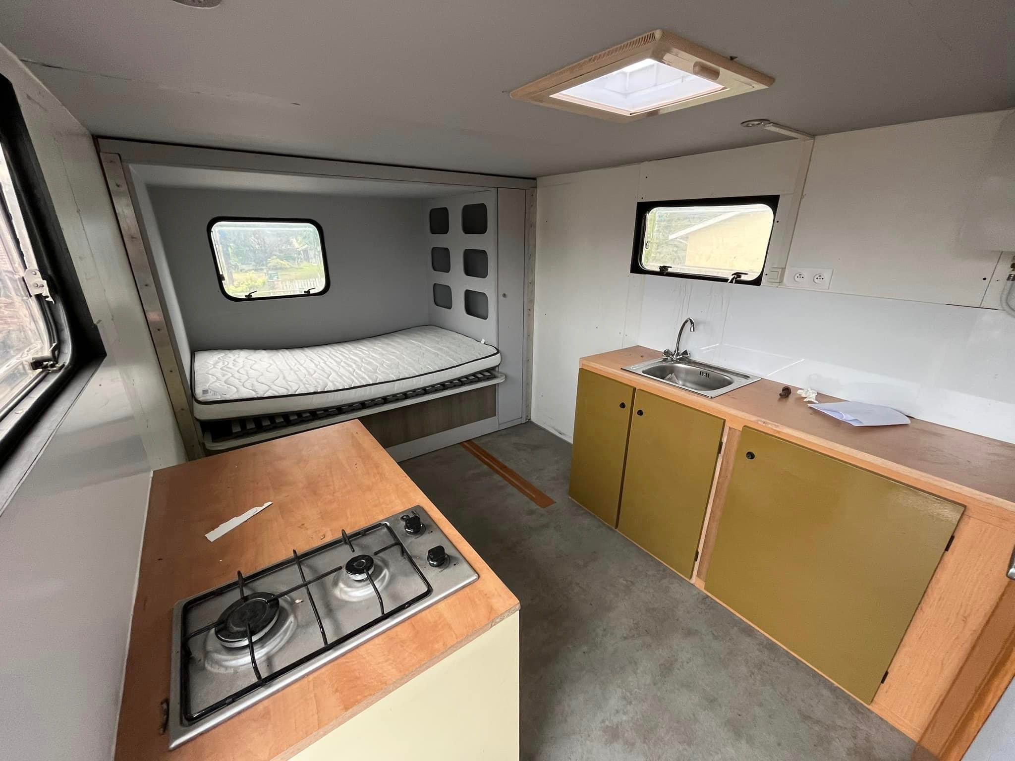Cette vente comprend le volume isolé + le plancher en CP + les portes de soute + le tube acier et les 2 naissances + 2 supports de coulissement + le boudin caoutchouc et brosses d'étanchéité + 2 matelas et leurs housses molletonnées amovibles (lavables); les matelas étant pliables en 3 pour chacun, logés pliés dans le volume durant les voyages.