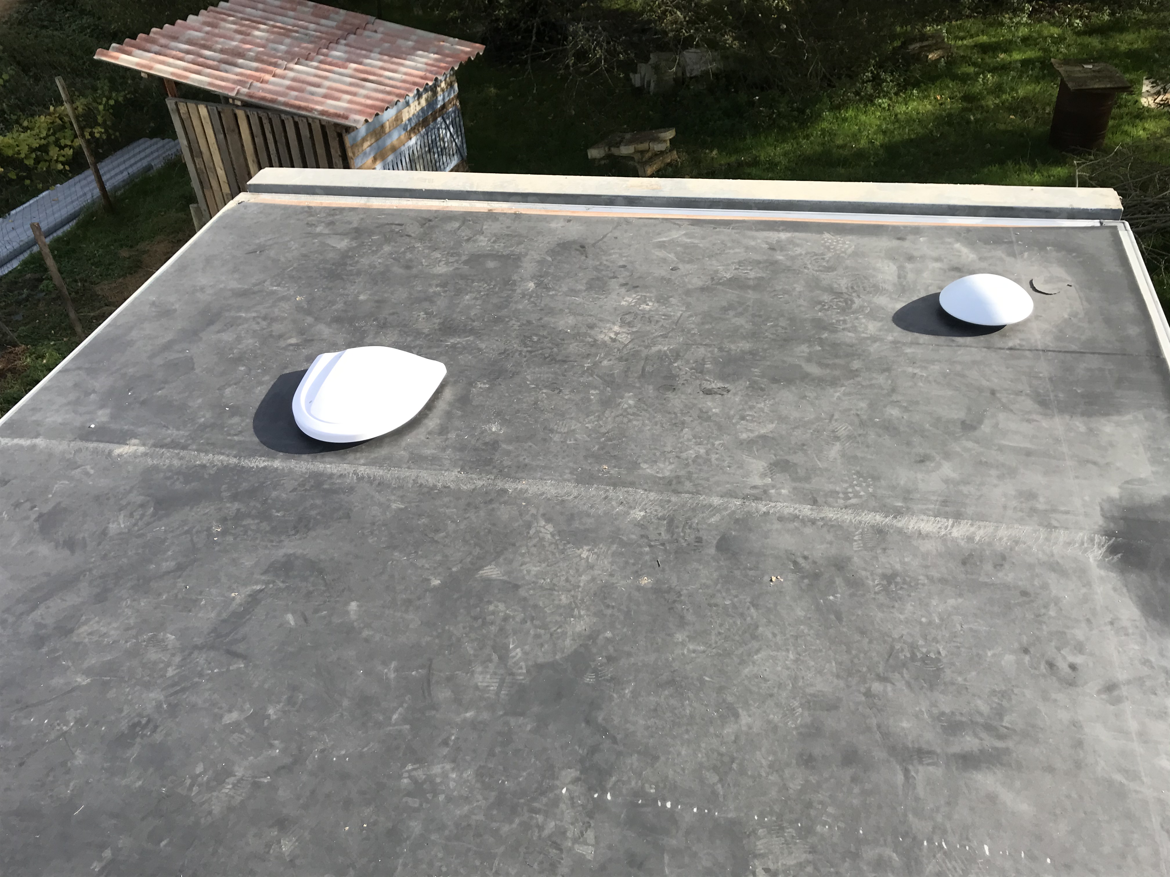 Finition étanchéité du toit , pose des ventilations chambre et salle de bain , en attendant les lanterneaux.