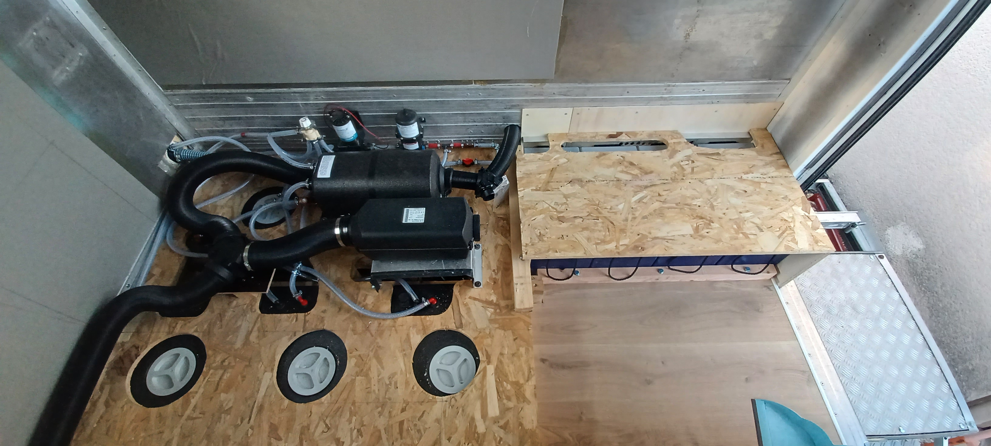 Chauffage Autoterm gasoil, Boiler 230v ou air chaud (donc gasoil indirectement), plaque de cuisson gasoil, wc broyeur 12v sans produit chimique...