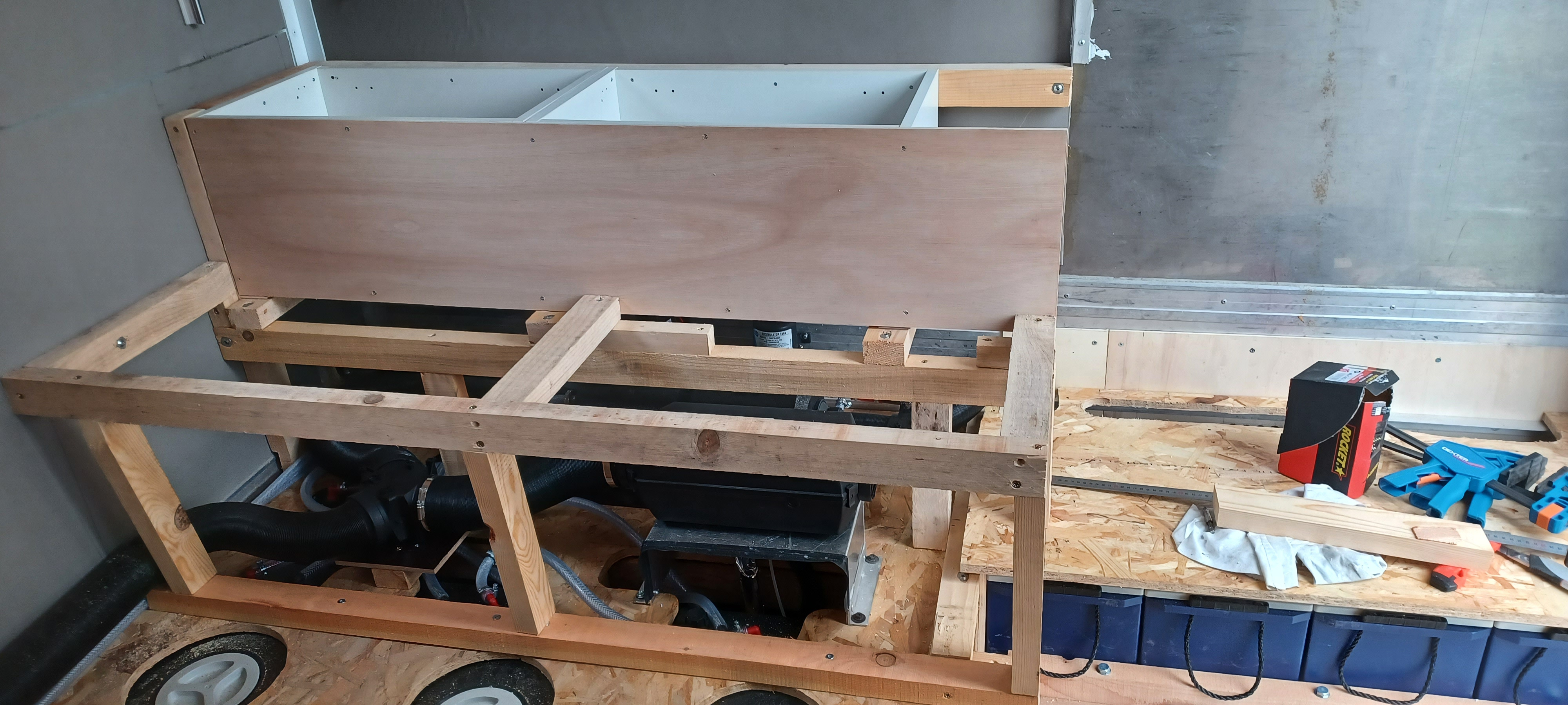 Pose du plan de travail avec évier et plaque de cuisson au gasoil de chez Webasto