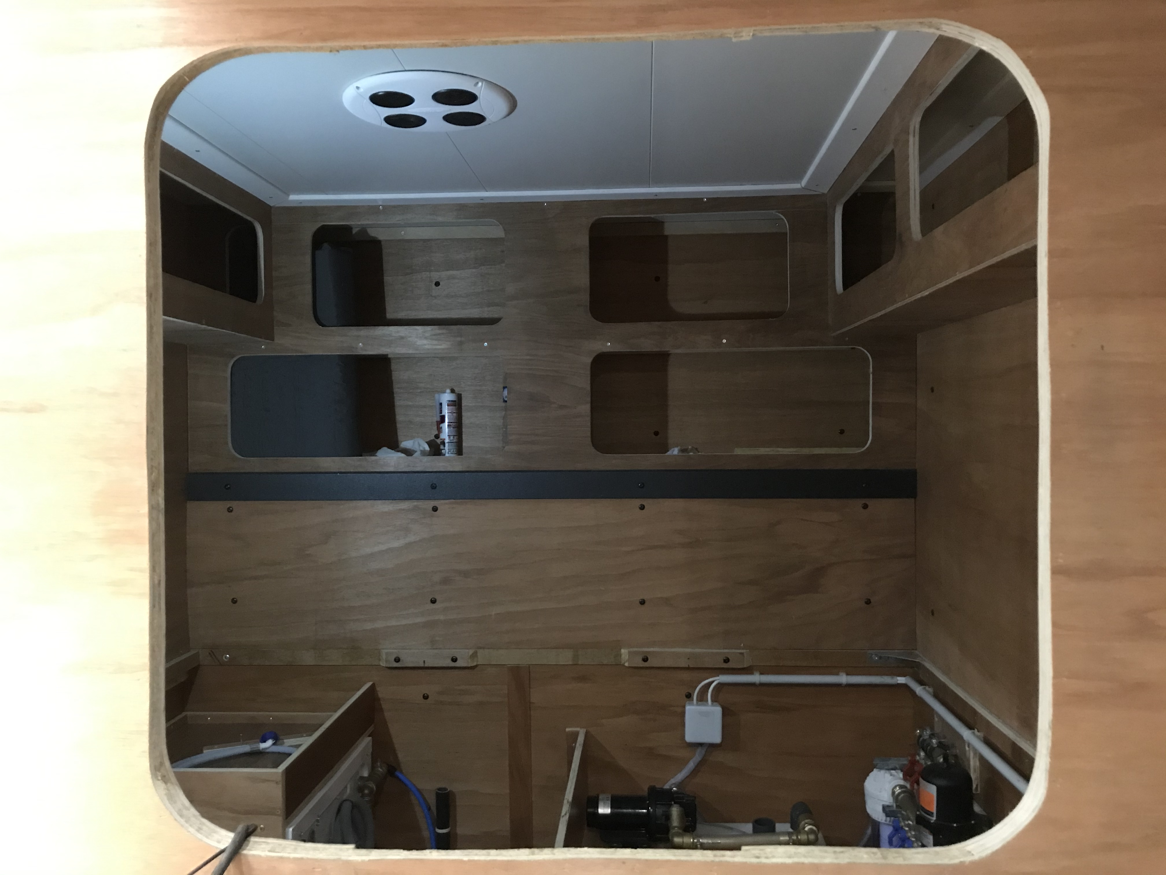 la meilleur solution est de créer un moule de salle de bain faire la pièce dans le moule et la poser dans la cellule. (dans les bateaux de plaisance c’est fait comme ça)