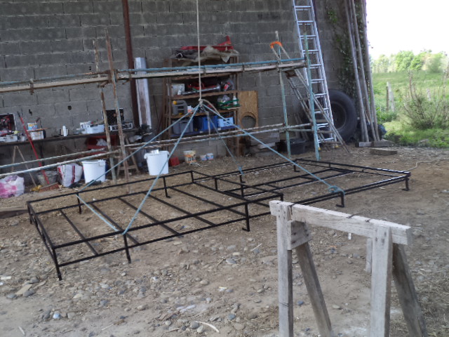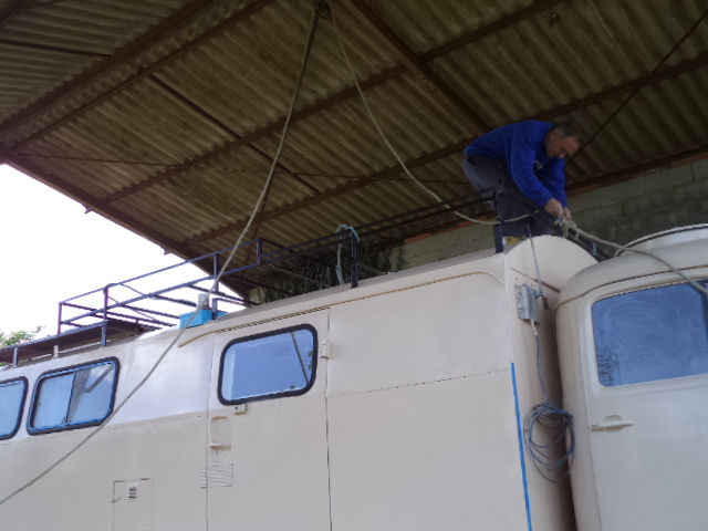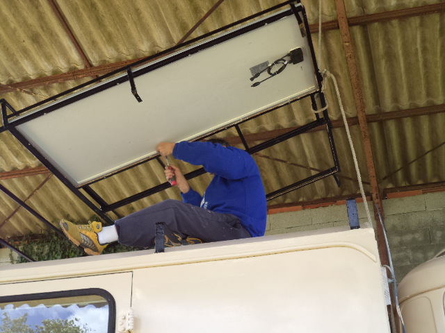 Bien, cela étant fait j'ai mis en place la galerie. Elle fait une cinquantaine de kilos. Je l'ai mise en place avant de placdr les panneaux photovoltaïques et le plancher en alu. Système D comme d'habitude pour grimper le truc.