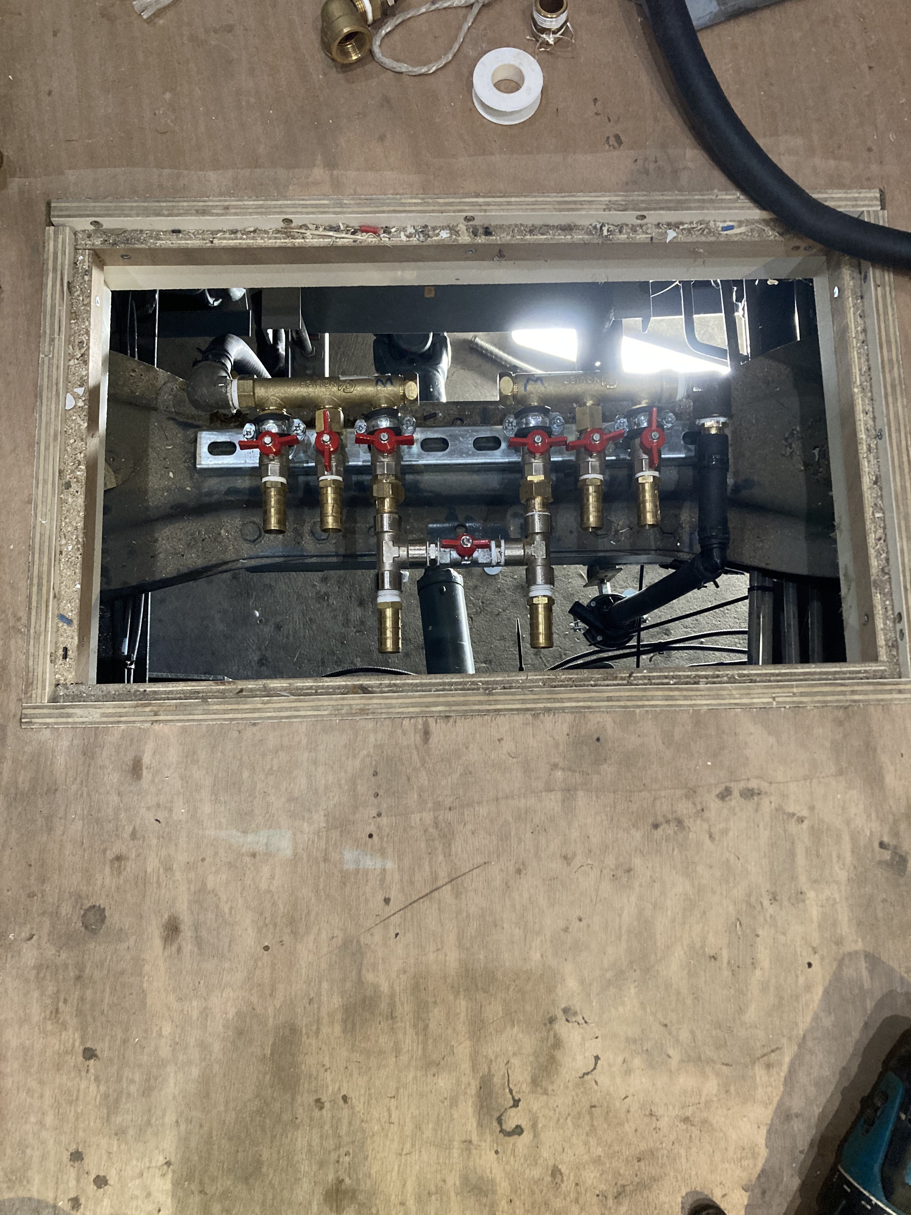 Mise en place chaudière sur son emplacement définitif après les essais Montage des nourrices sortie chaudière donc liquide chaud et nourrice retour . On peut remarquer le By-pass moteur . Donc une alim boiler , une alim aérotherme et une moteur .