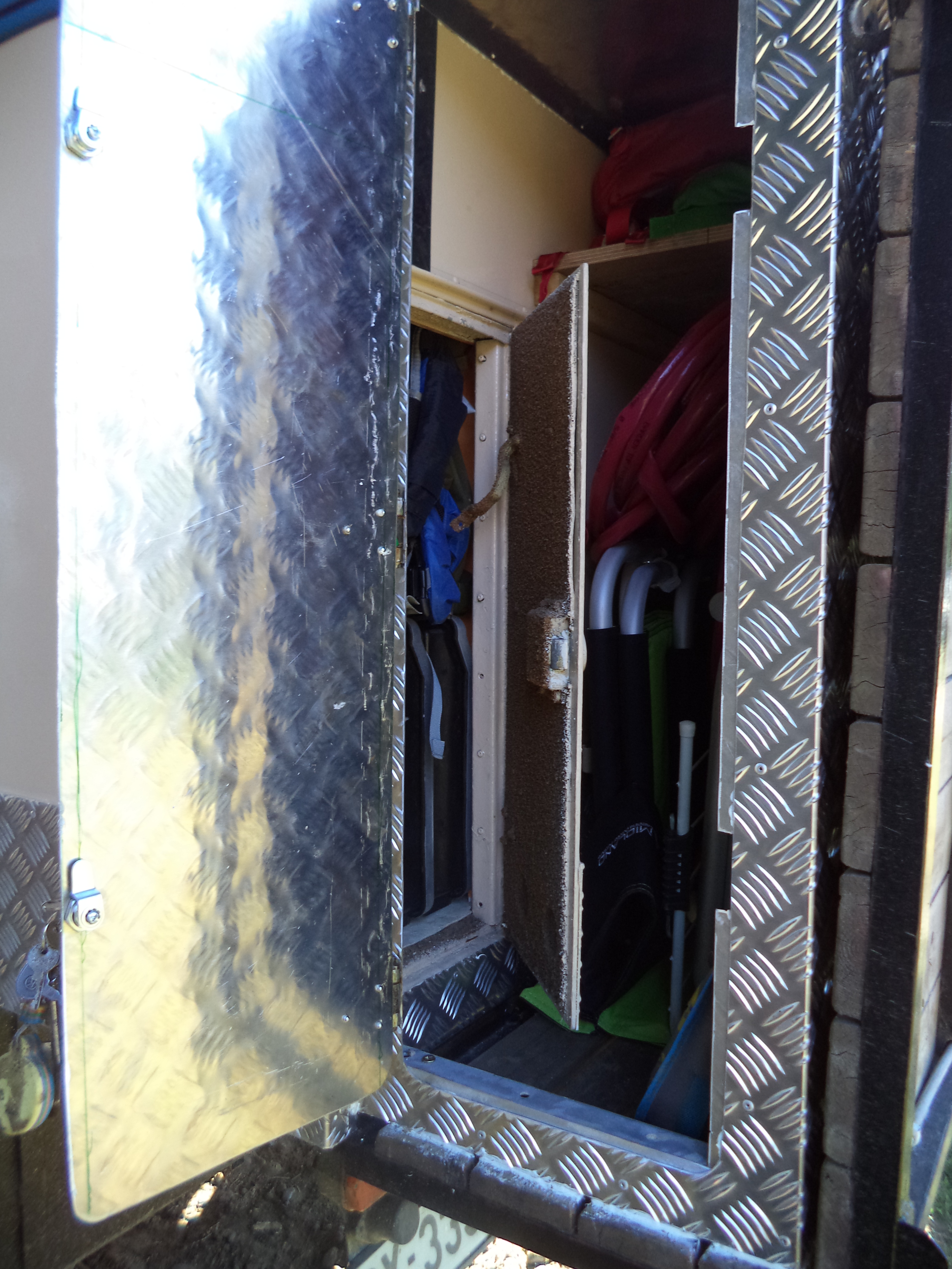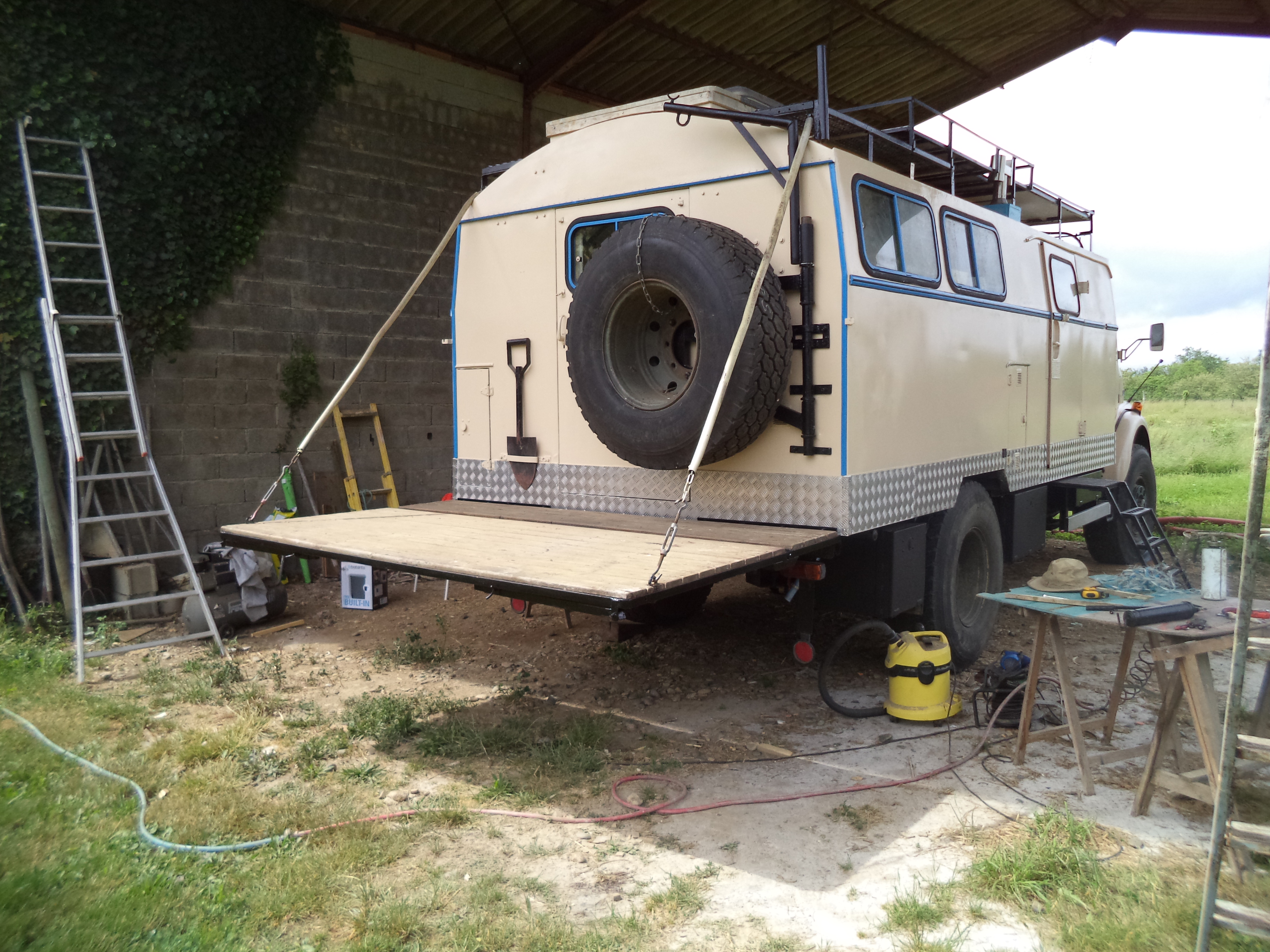 Enfin, je suis en train de faire un coffre volumineux sur le rebord fixe de la terrasse, à côté de la roue de secours. Là je rangerai la table, les chaises, les hamacs (on a de grand projets) la toile du auvent etc... Ainsi quand on va s'installer quelque part tout sera à disposition rapidement.