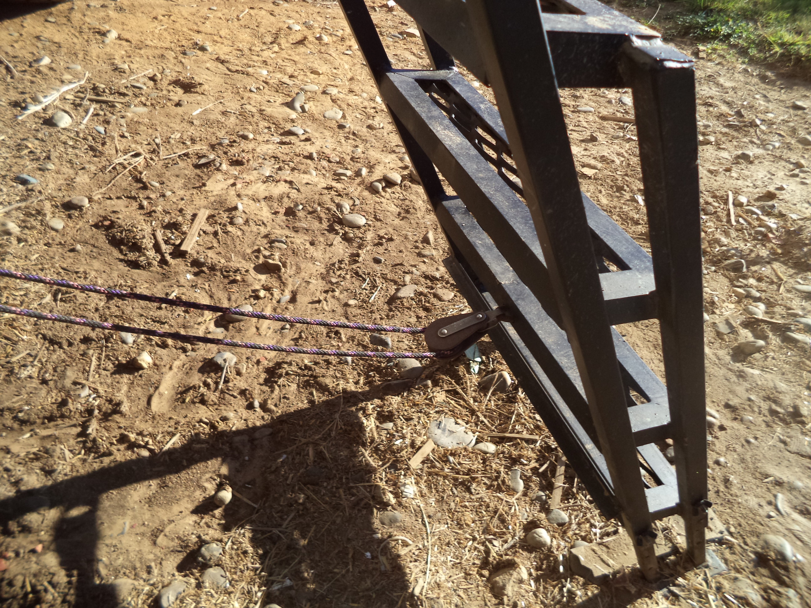 L'escalier d'ailleurs que j'ai adapté un peu pour le rendre plus pratique. ceci avec un mouflage fait de trois poulies, une corde et un taquet pour bloquer l'ensemble, le temps que je le verrouille. Et hop