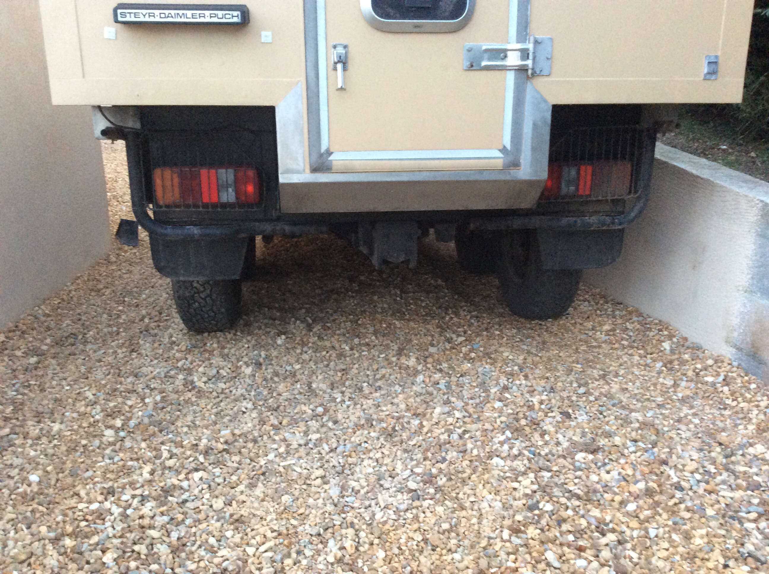 b) Sa partie la plus éloignée du plan longitudinal de symétrie du véhicule doit se trouver à moins de 46 cm de l'extrémité de la largeur hors tout de l'arrière du véhicule ;