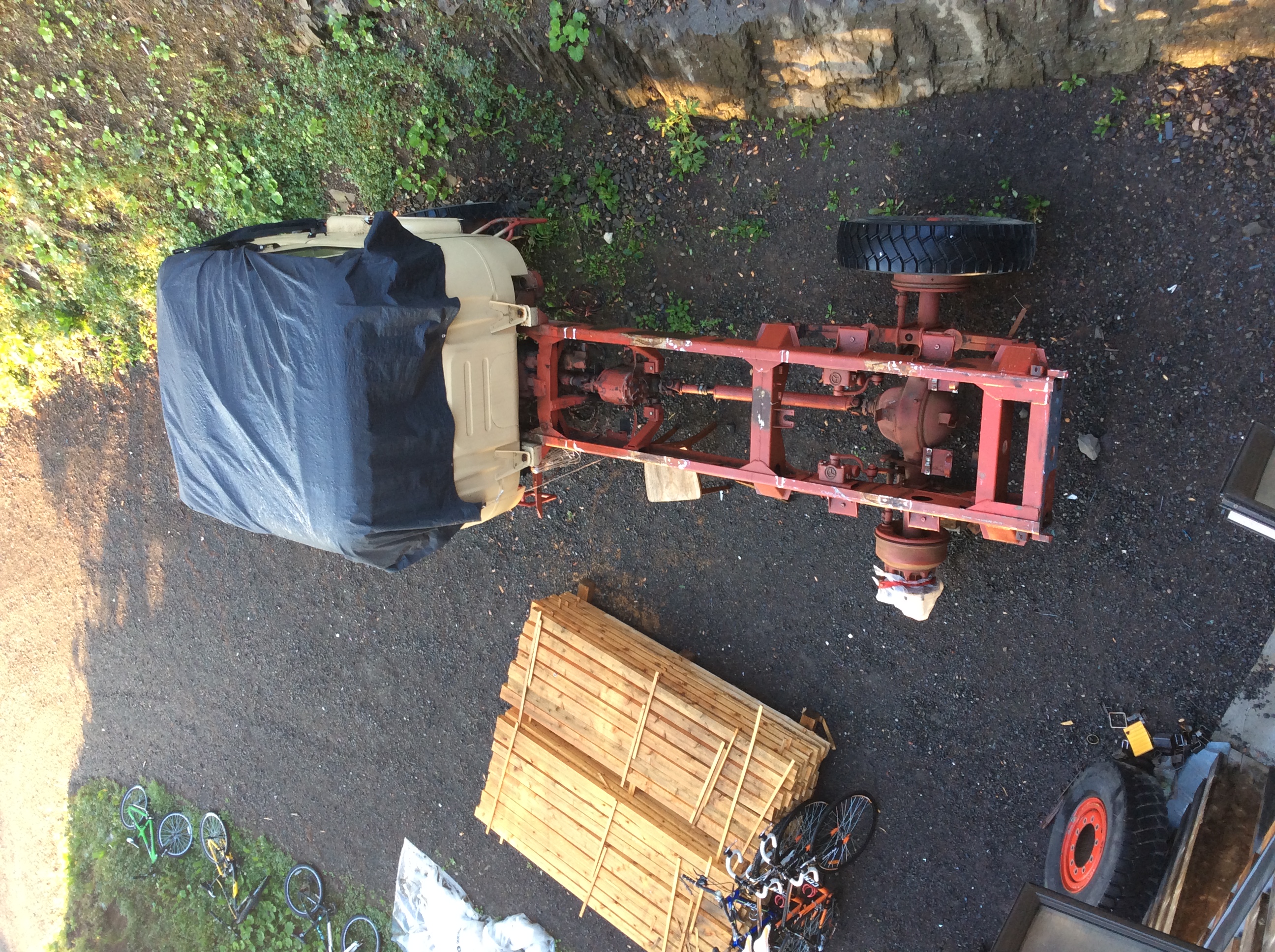 Pour la sortie, l'arrière de la cellule portera sur les 2 roues de secours (elles-même sur un essieu permanent posé à la partie en acier à 45°). Pour l'avant de la cellule, une technique ancienne style rouleaux rapportés sur 2 pièces longitudinale devrait faire l'affaire... le tout tiré par le futur treuil fonctionnel du camion ? Ou quelque chose du genre !