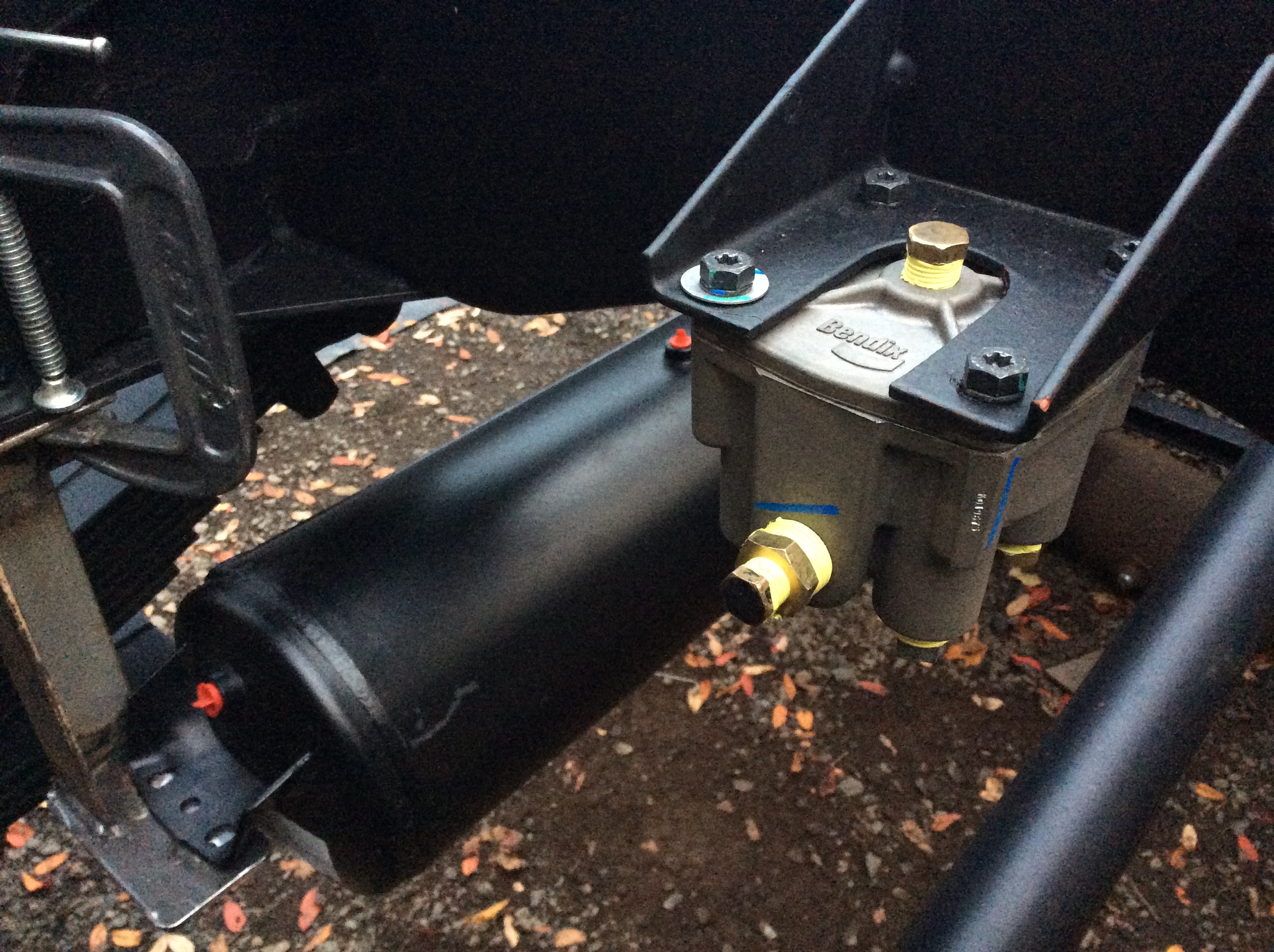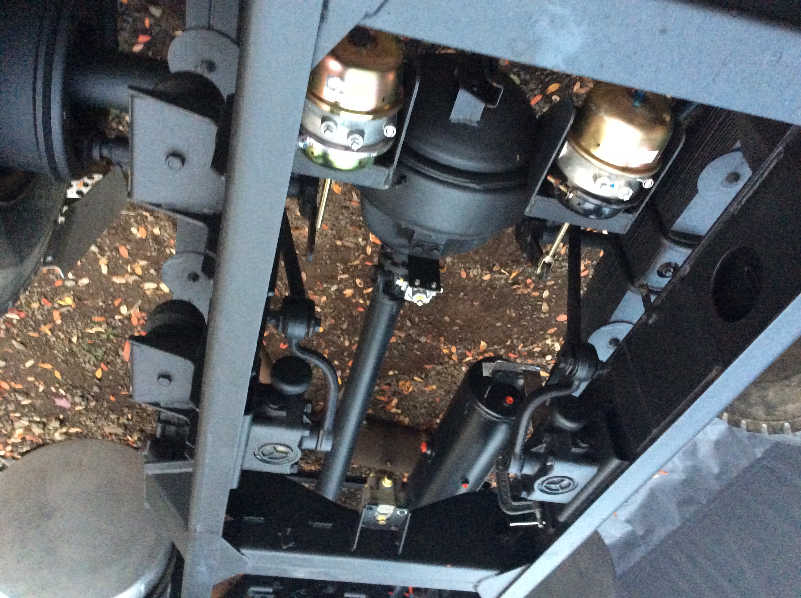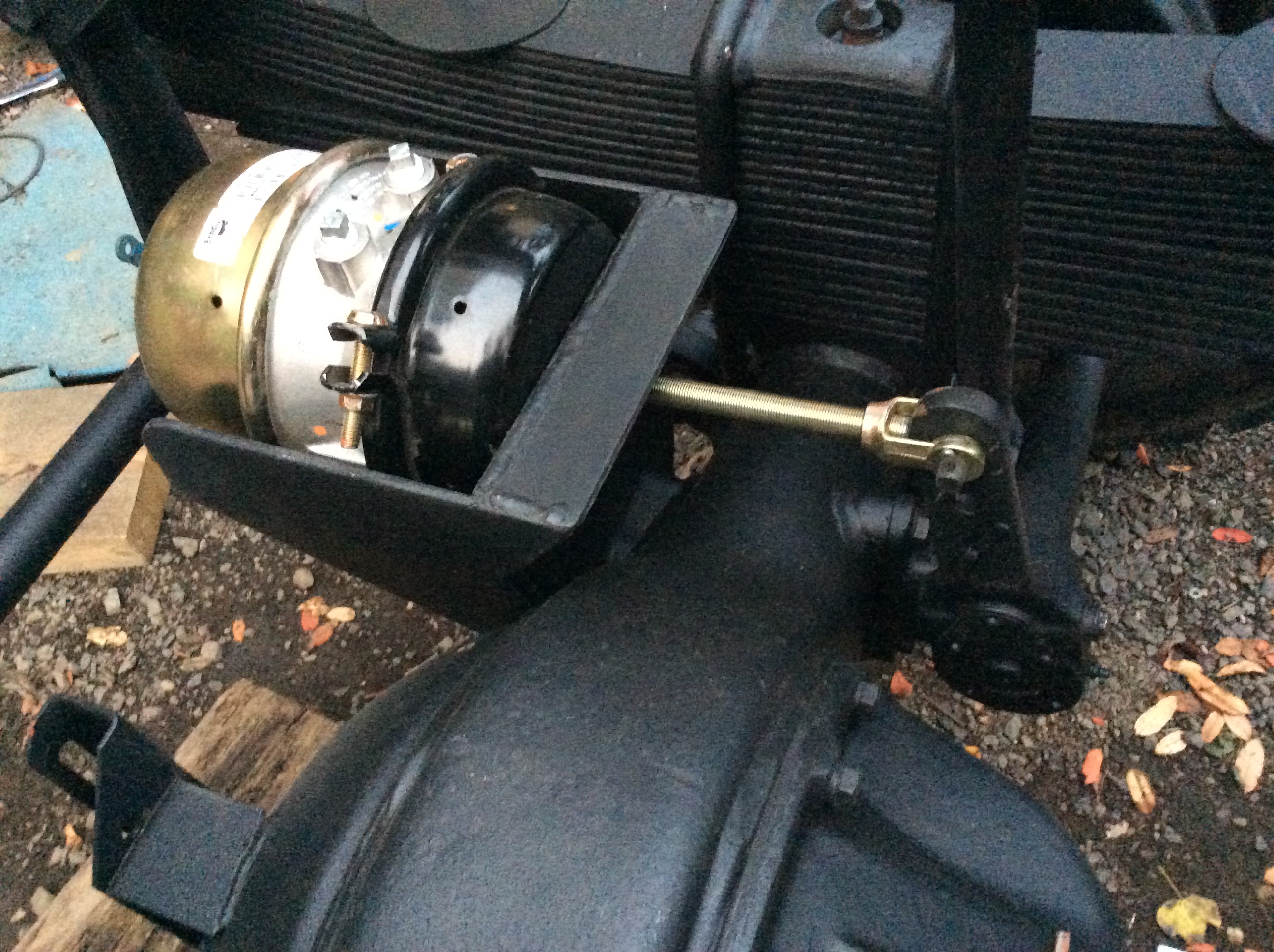 Finalement, pourquoi prendre des chance et remettre des mécanismes pneumatiques vieux de 40 ans ? On remplace par des pièces nord-américaines neuves. Ici, 2 booster (cylindres double action) de camion 3030 avec leurs supports customisés.