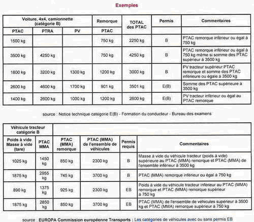 • Le permis EB est nécessaire quand le poids total autorisé en charge dépasse le poids à vide du véhicule tracteur, ou et lorsque la somme des deux poids total autorisé en charge dépasse 3500 kg.