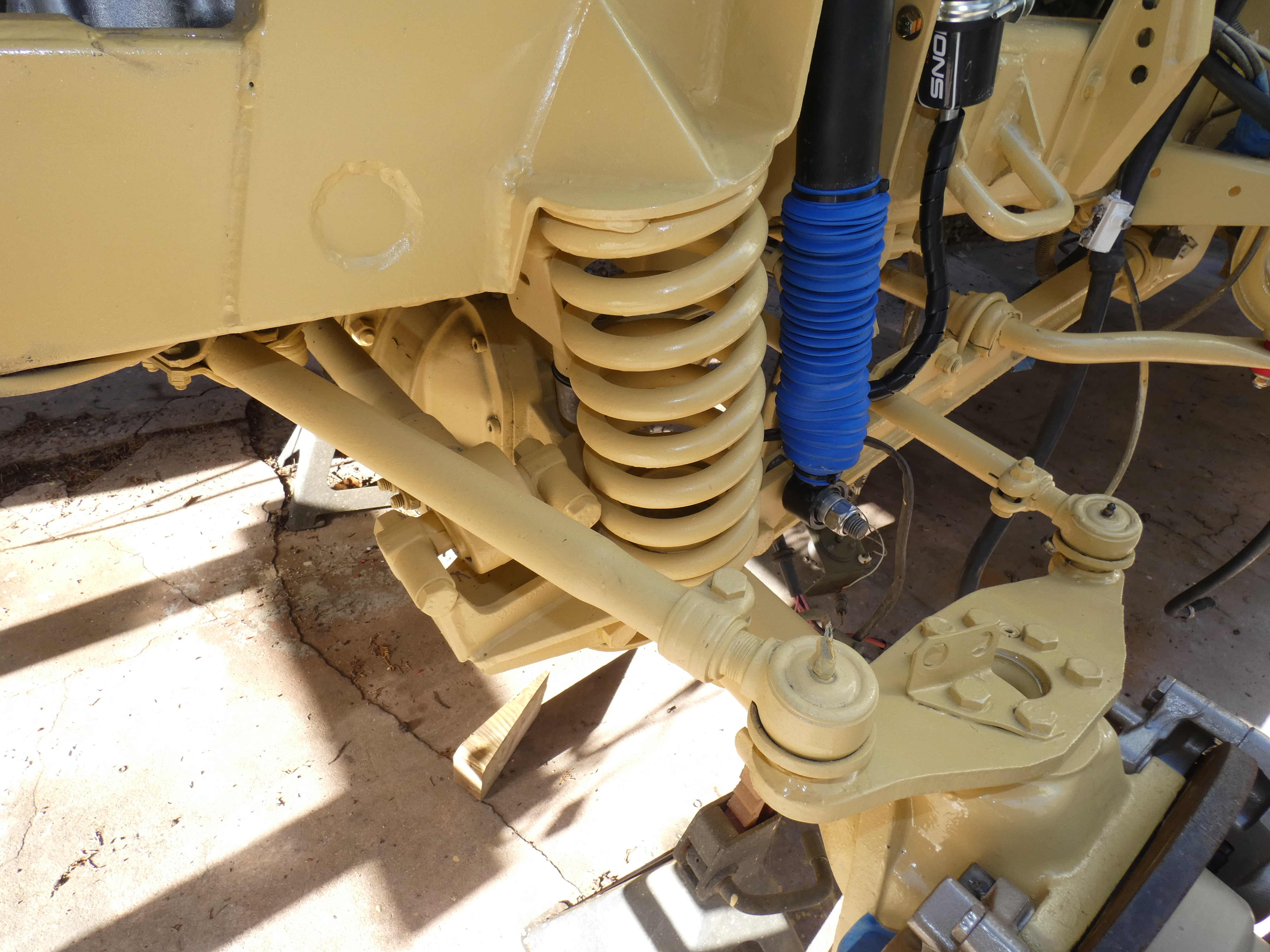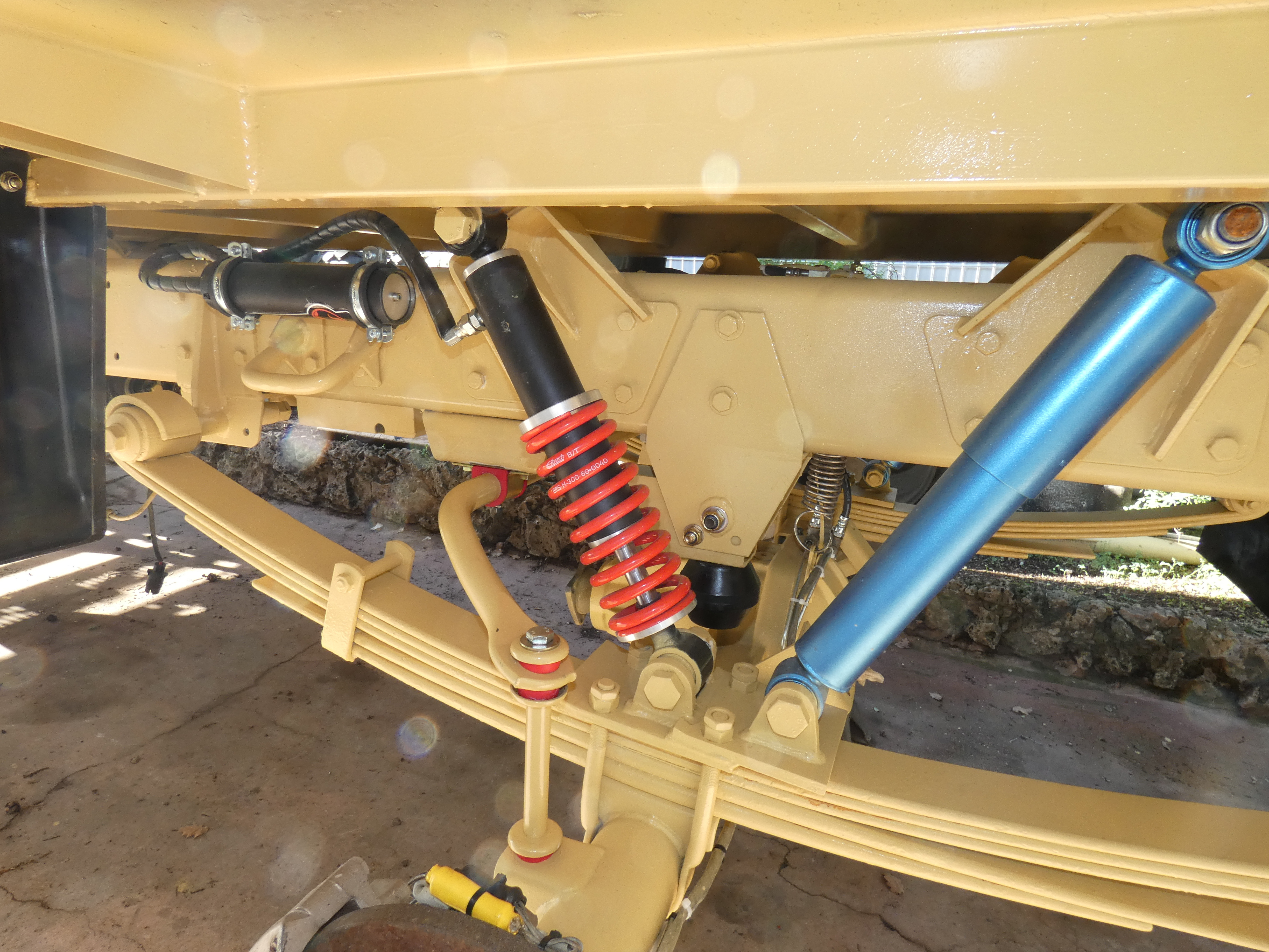 ... A l’arrière j’ai installé des amortisseurs avec ressort afin de soulager la courbure des lames et de rehausser les buttées de pont qui avaient trop tendance à talonner (risque de refus au contrôle technique)...
