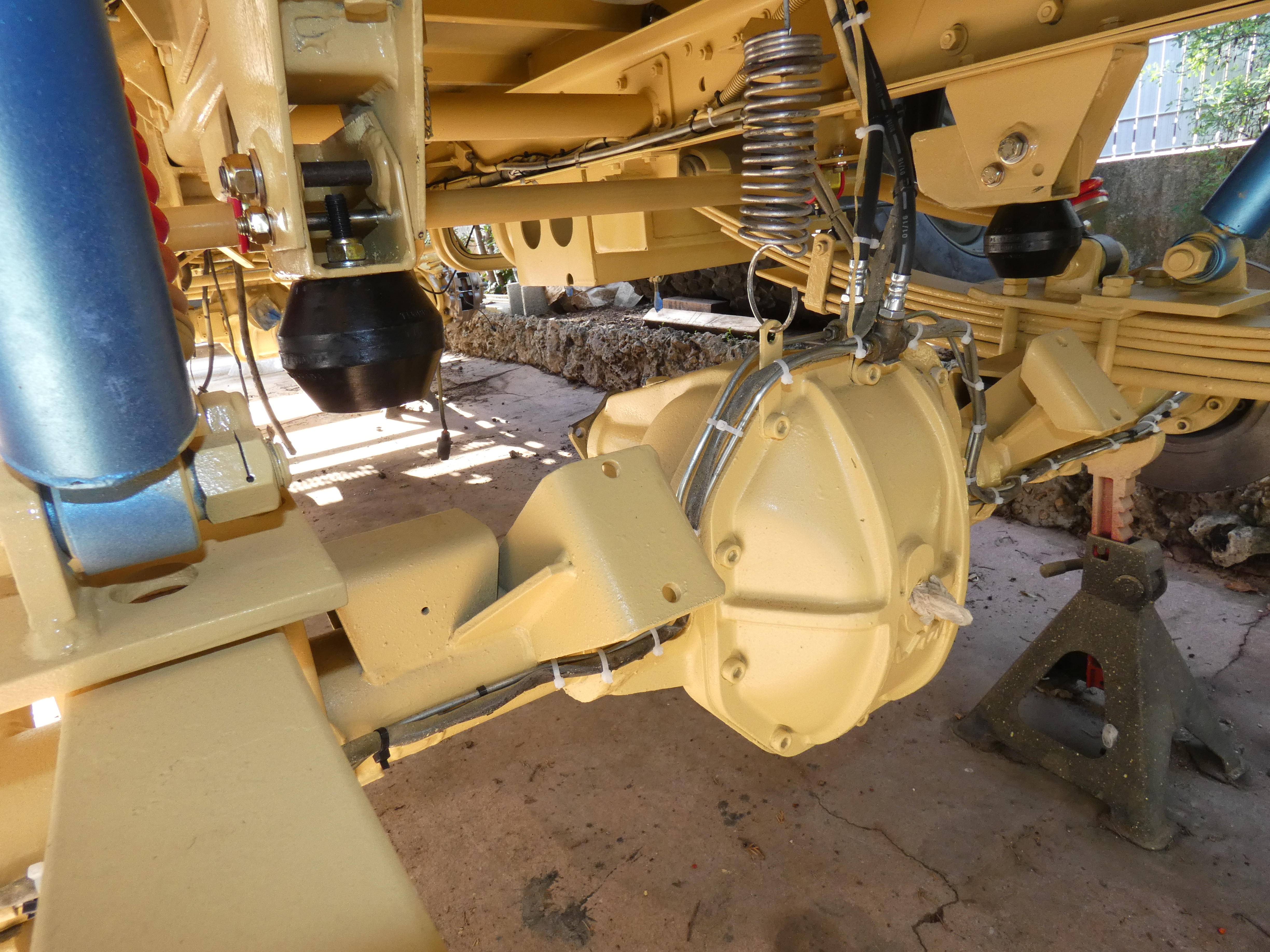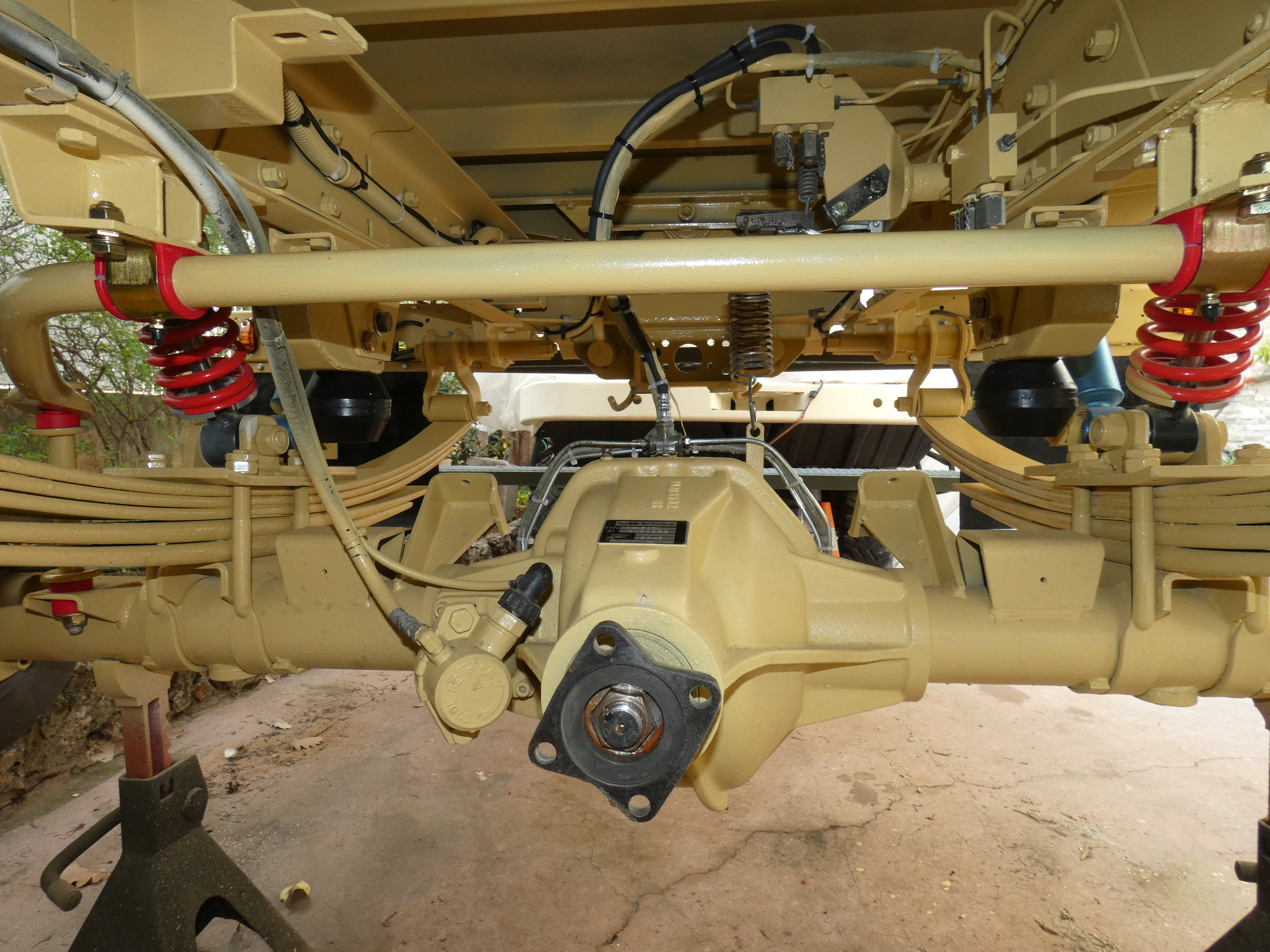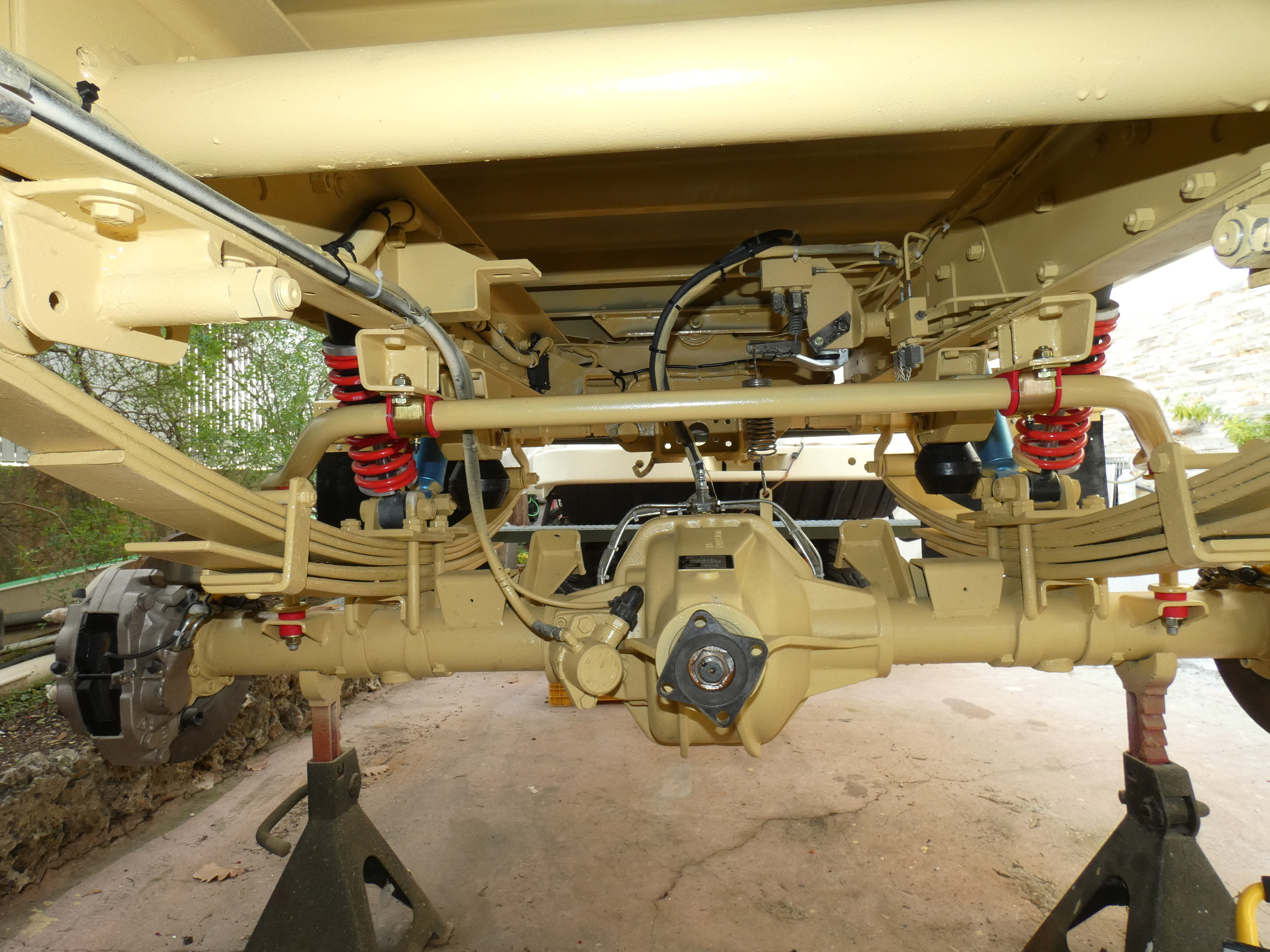 A l'arrière, le problème est différent car nous avons un paquet de lames qui finissent avec le temps par s'affaisser, j'ai don rajouté un combiné ressort amortisseur, pour soulager les lames, relever un peu le châssis afin que les butées de pont ne touchent plus le pont.