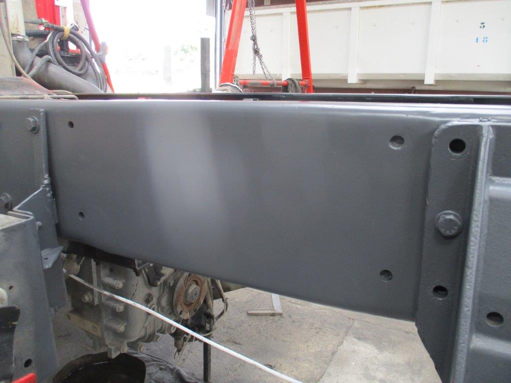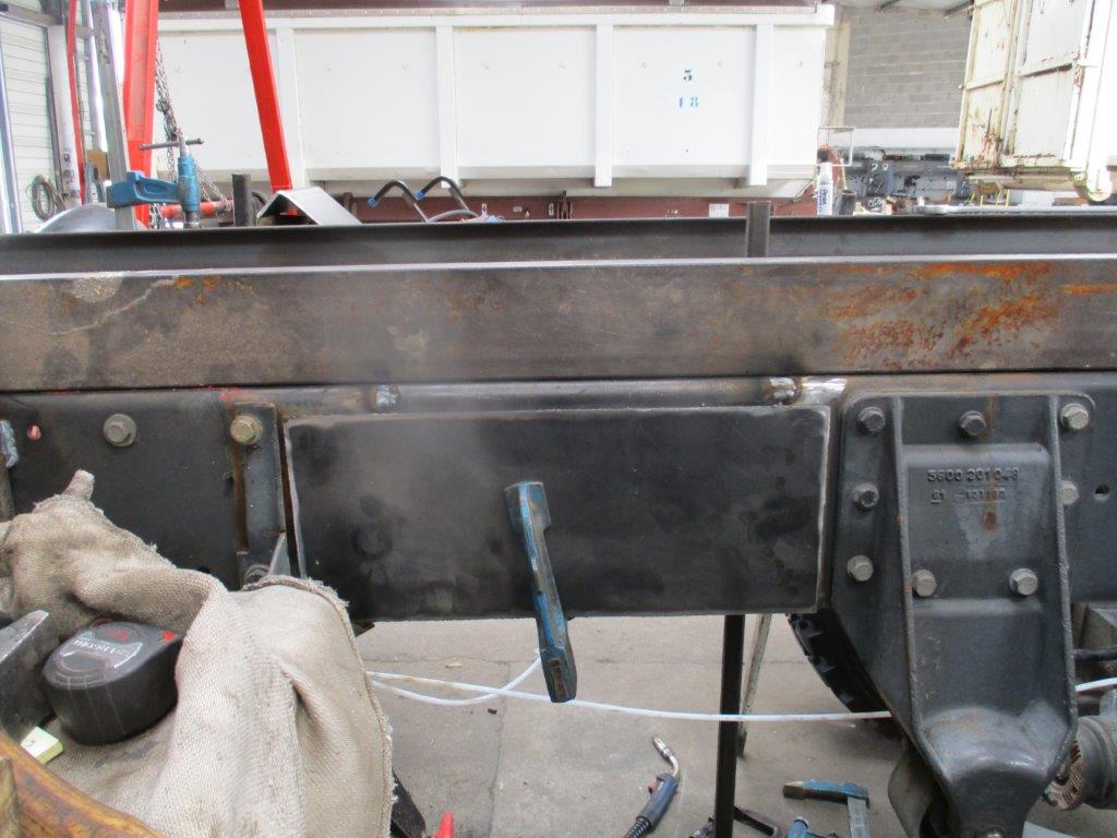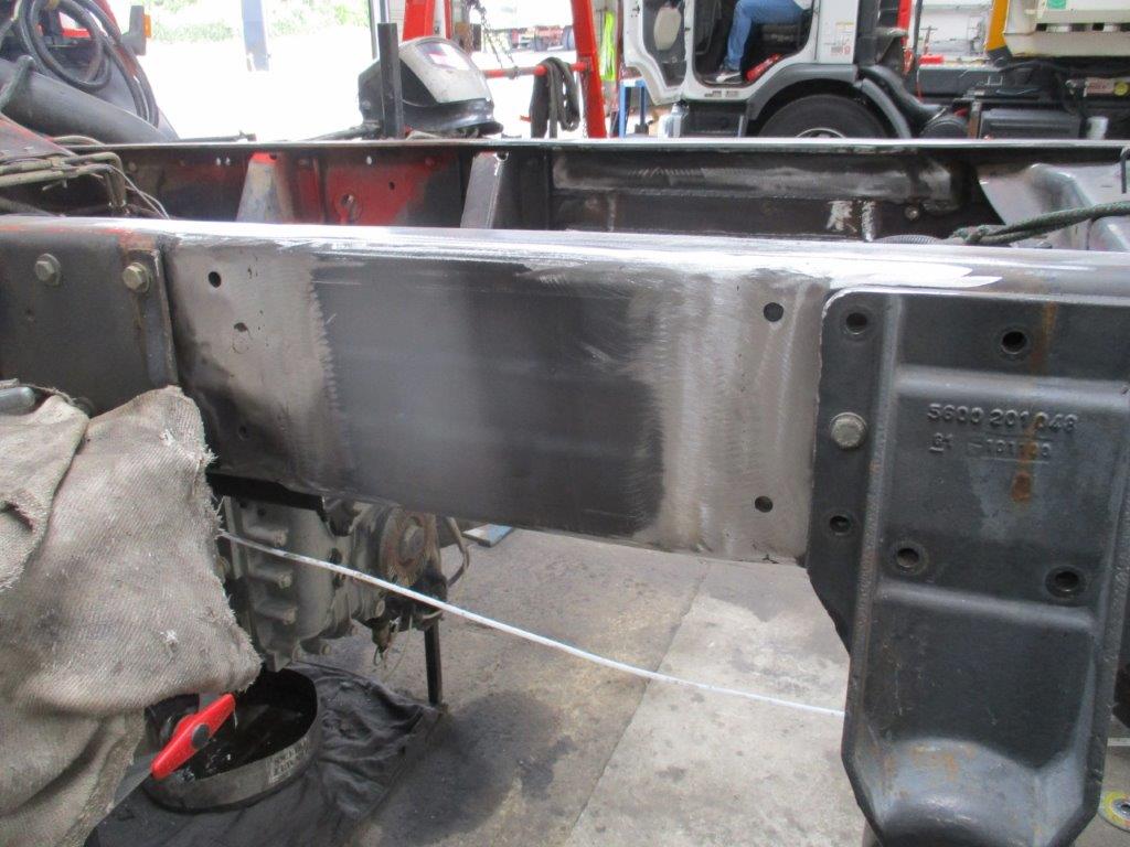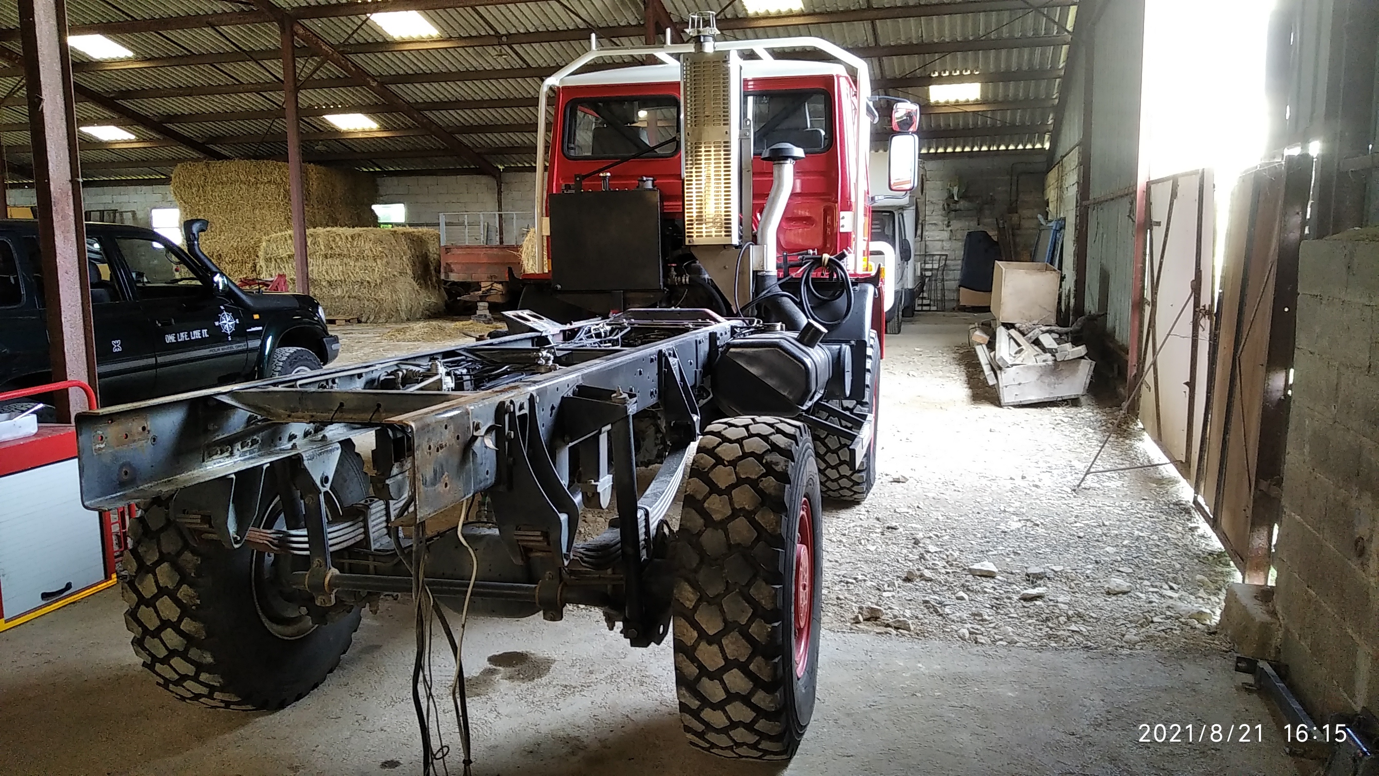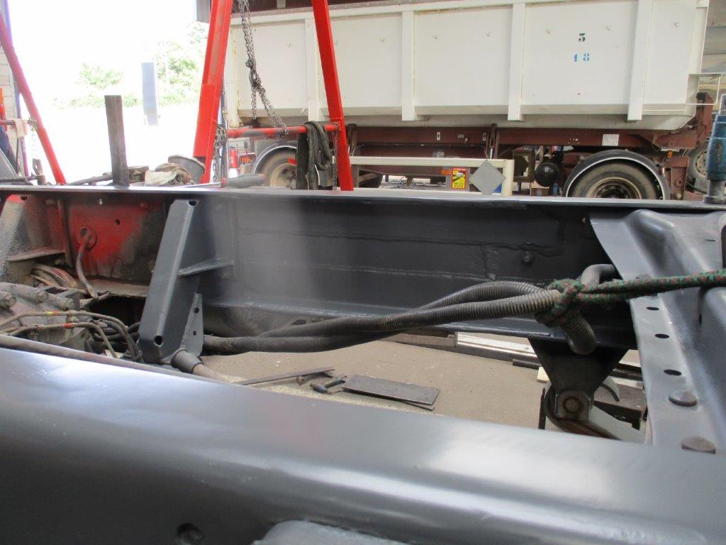 Le châssis peut désormais recevoir une belle cellule de 5.05m. Par contre madame veut absolument un passage cabine, qui nécessite de déplacer l’échappement, le réservoir d’hydraulique, l’admission, vase d’expansion et réservoir lave-glace.