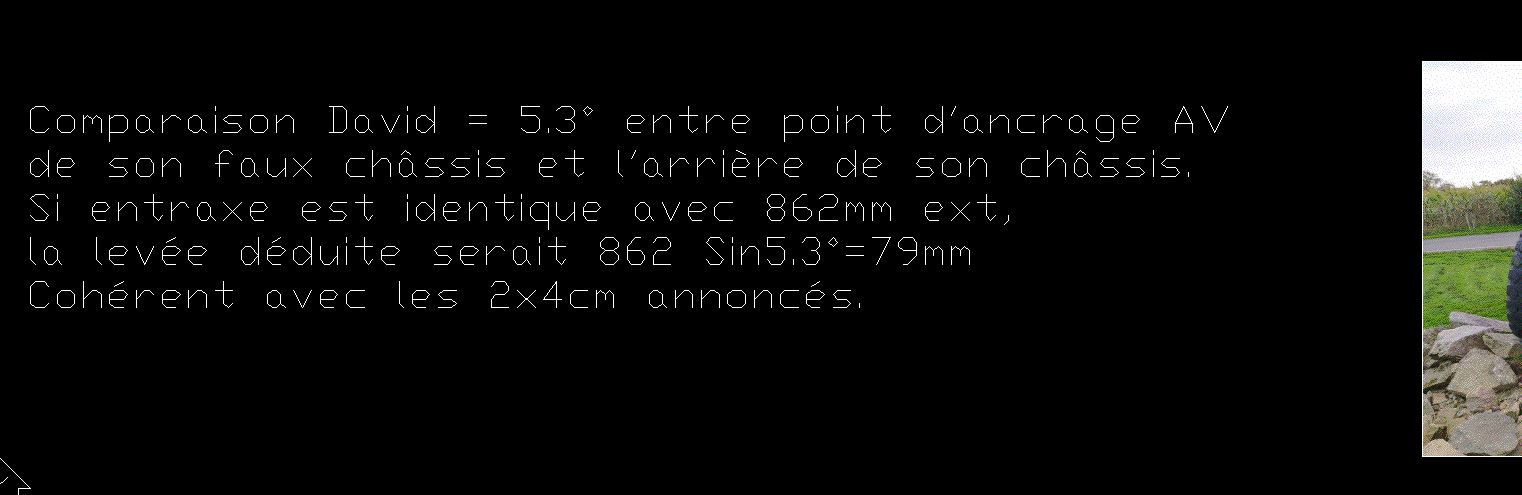 Aujourd'hui, Garfield est à poil, et l'arrière de mon châssis est totalement remonté de.... je ne sais combien justement. Mais en croisant différents éléments, mesures, photos, je l'estime à 11 cm environ.