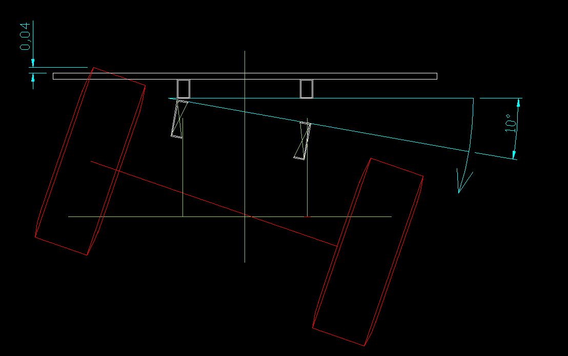 Je pense qu'il faut néanmoins modérer cette configuration extrême car la barre anti roulis devrait diminuer la dissymétrie de déformation des suspensions et donc la prise d'angle des lames du pont par rapport au châssis, et enfin la liaison semi-rigide châssis / faux châssis devrait diminuer légèrement sa torsion du châssis. Je vais prier Saint Renault en espérant que ma roue ne défonce pas mon plancher sur la base de cette conception.