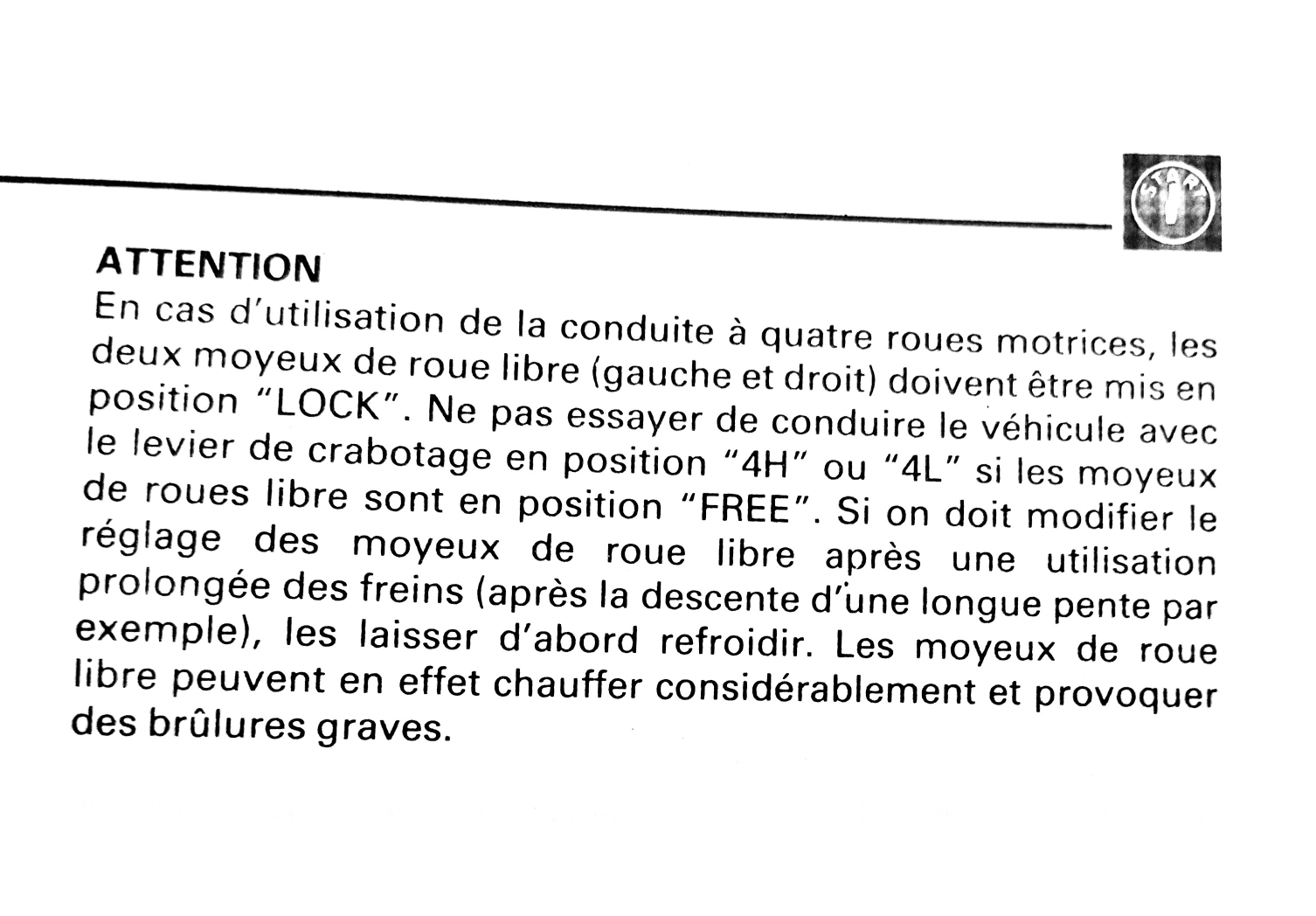 -de ne pas avoir les 4 roues en prise lorsqu'on est sur le dur et surtout si on a besoin de tourner (que ce soit en débrayant les moyeux ou en passant en 4x2 ou les 2)