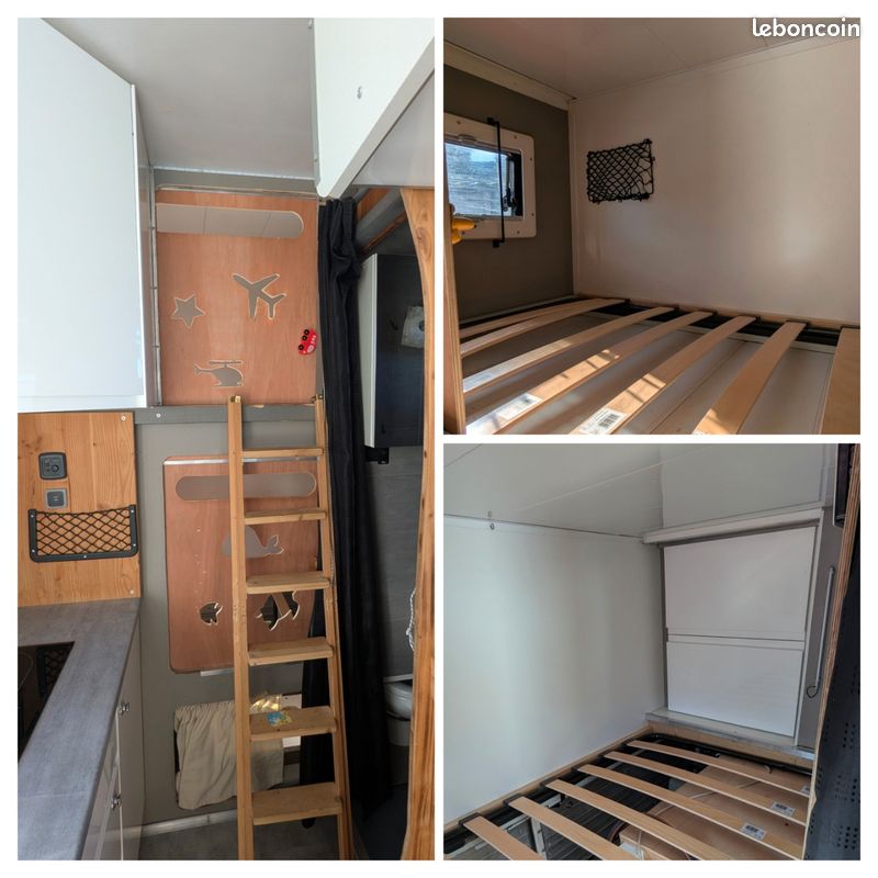 cellule prête à accueillir 4personnes (2 couchages enfants supplémentaires possibles). Elle n'est actuellement plus sur le camion mais posée au sol.