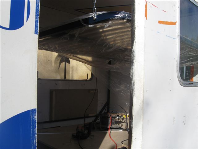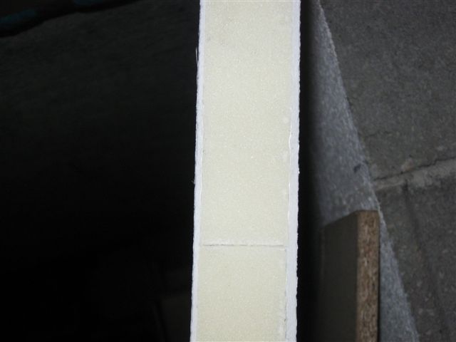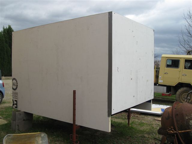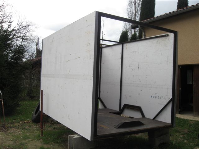 mes panneaux sont enfin arrivés, ça valait le coup d'attendre, ils ont été récupérer sur une caisse frigo accidentée. ils font 45 mm d'épaisseur et sont en polyester. il pèse 12 kilos au m2 soit 312 kg en tout. je vais les coller et les visser sur la structure en tube.
