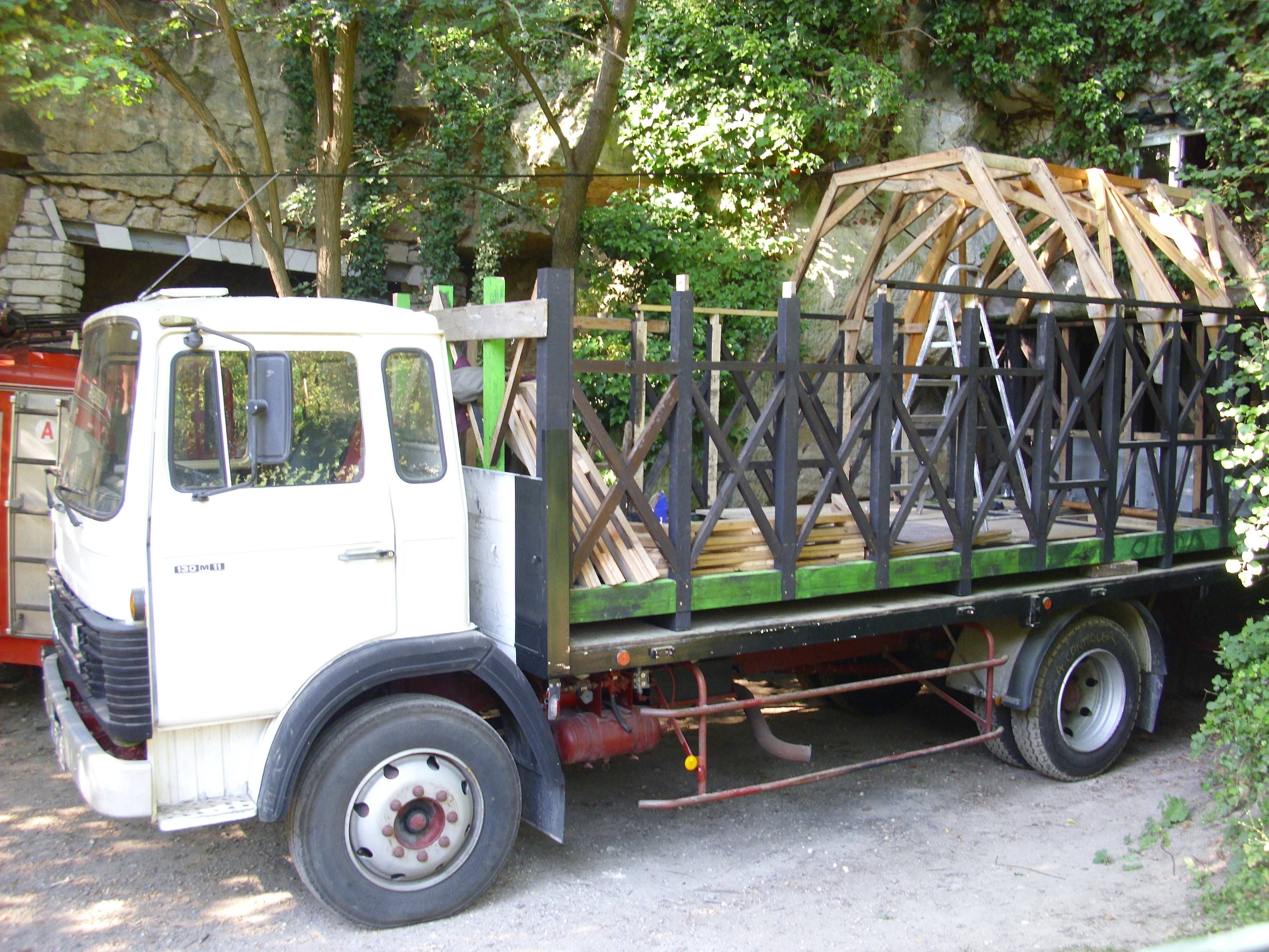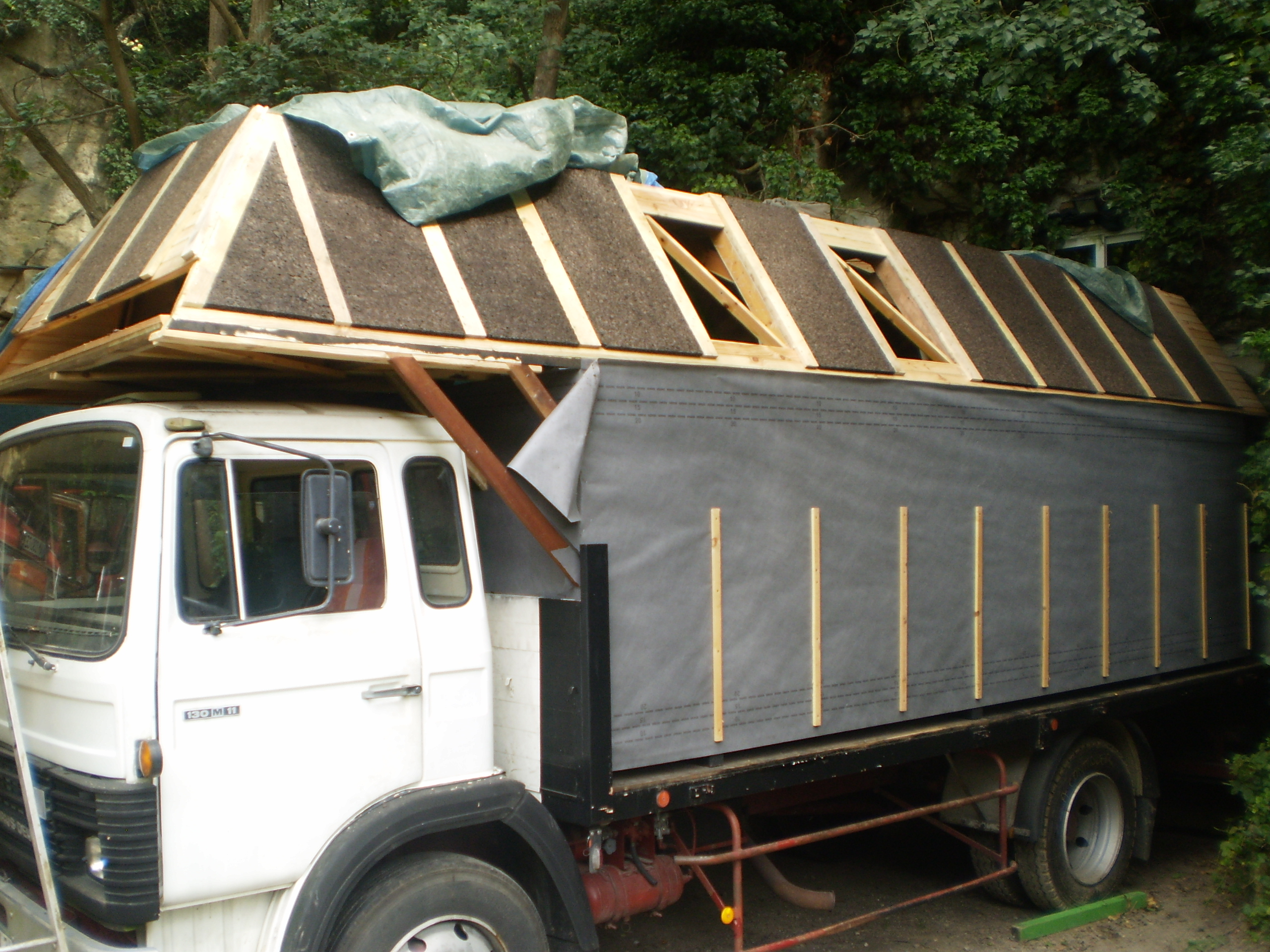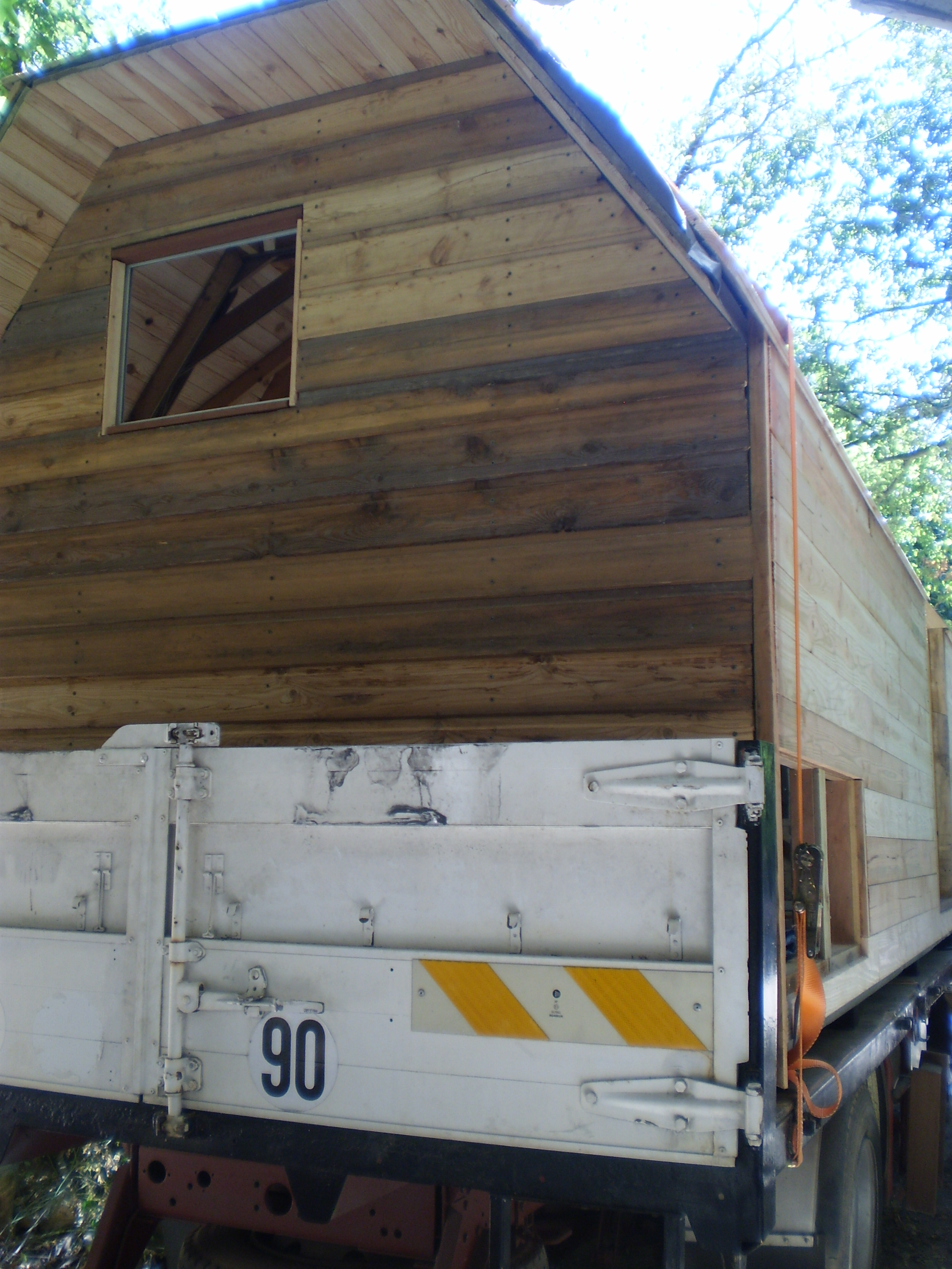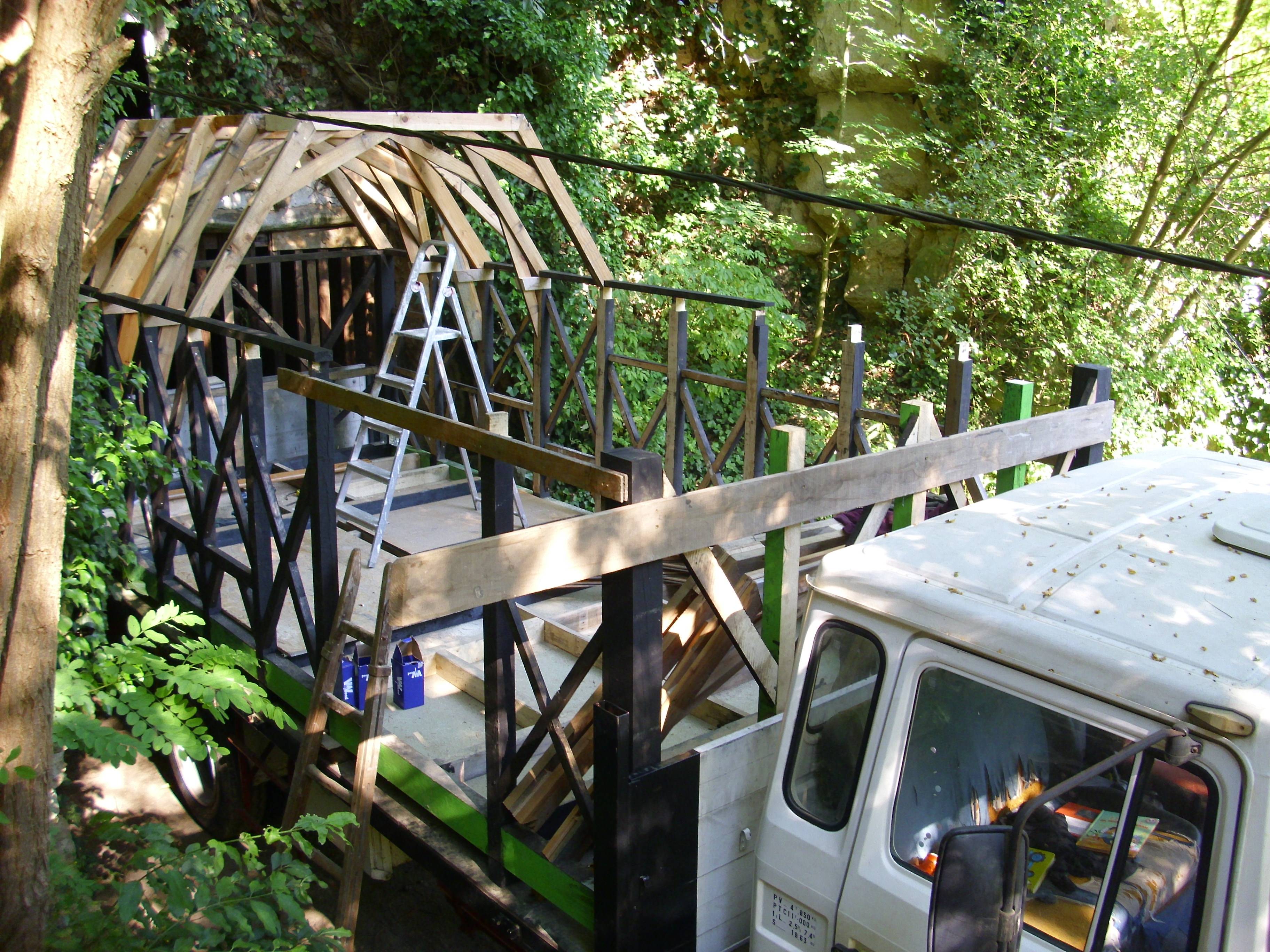 bonjour Olivier, est-ce que je comprend bien ces photos,ce serais une charpente bois,habillé de ctbx et posé sur un plateaux de camion ??? La charpente est bien faite, mais les connections vont-elle résister aux vibrations, en terme de poids qu'en est-il ?