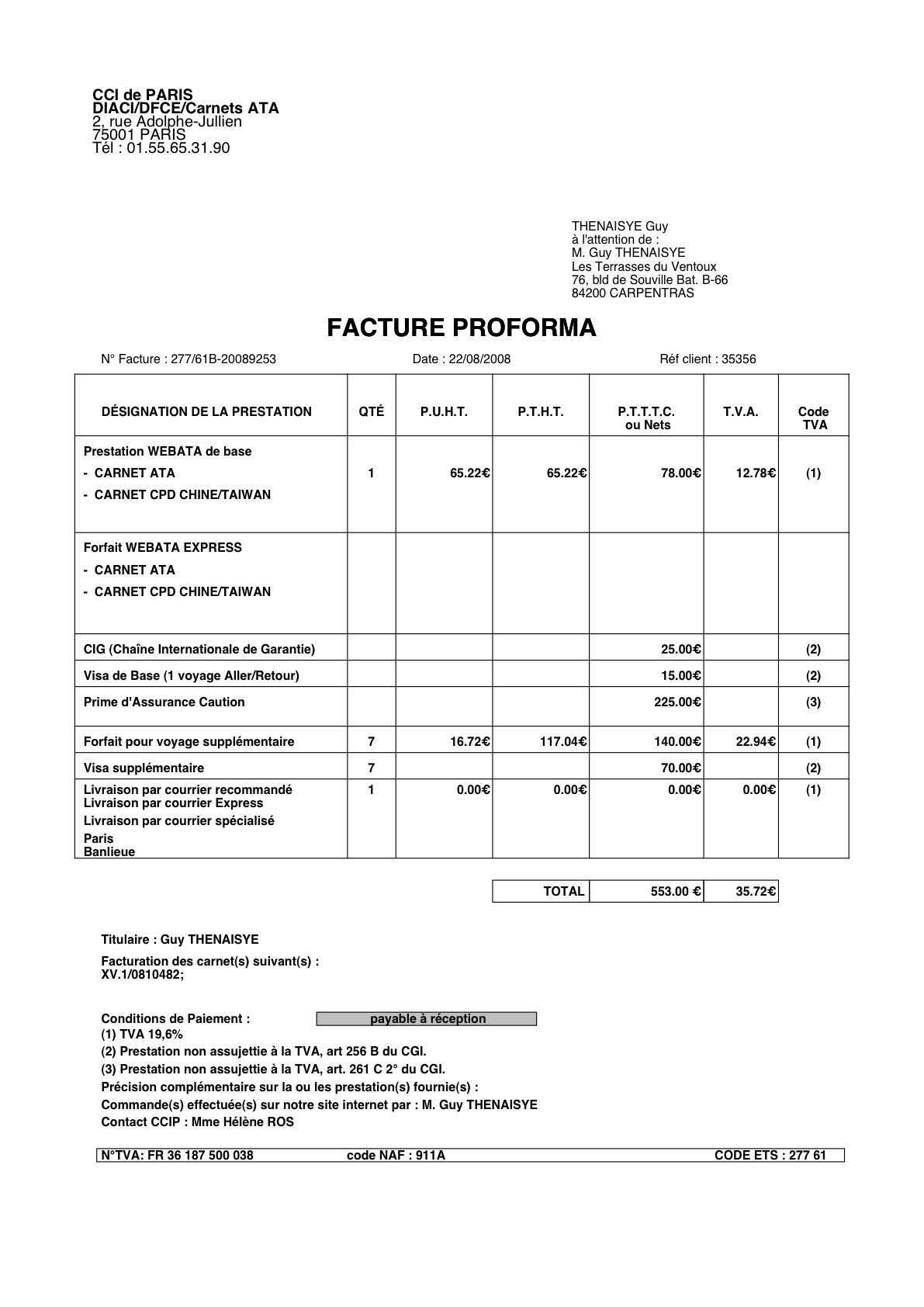Ci-joint facture Carnet ATA et première page.