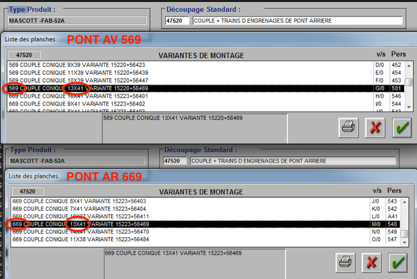Sur ces camion en 4x4 avec le pont AR 669 et le pont AV 569 on à que deux choix possible... 7x41 et 8x41 pour les couples conique.