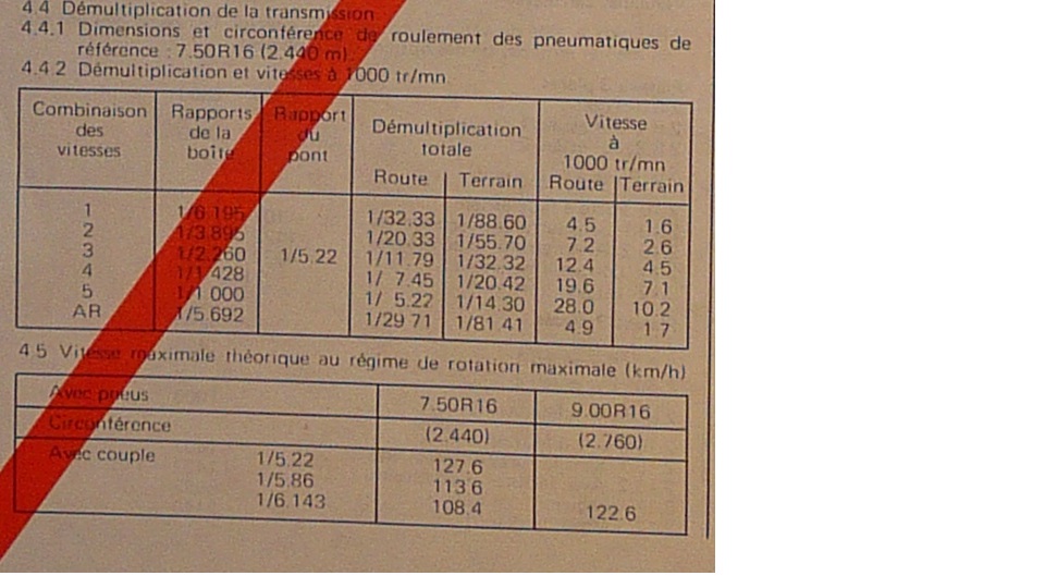 Avec des ZXL 900R16 (255/100 R16) (2.8m) ça donnerais pour un couple conique en 8x41 : ça donnerais à la louche 97km/h à 3000tr/min