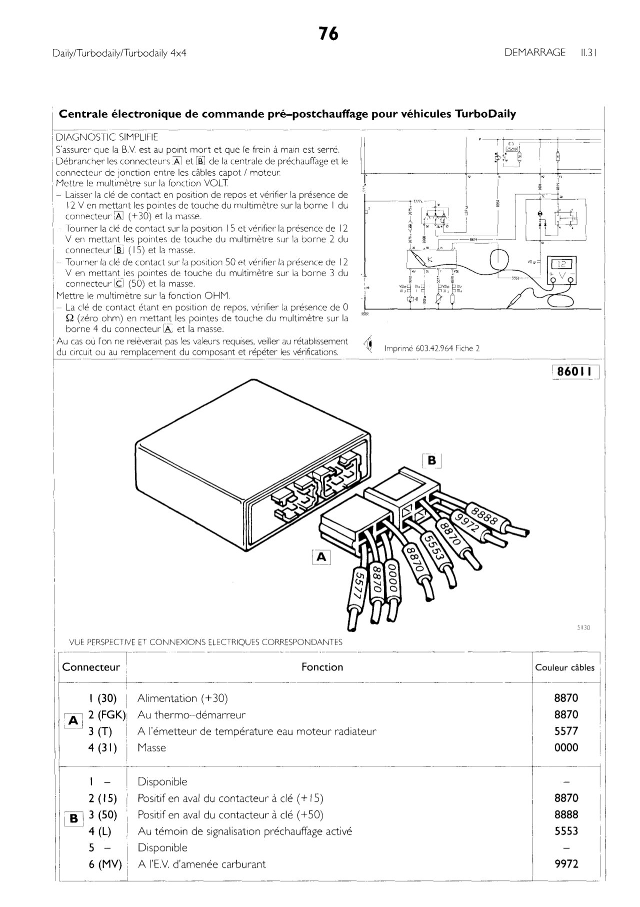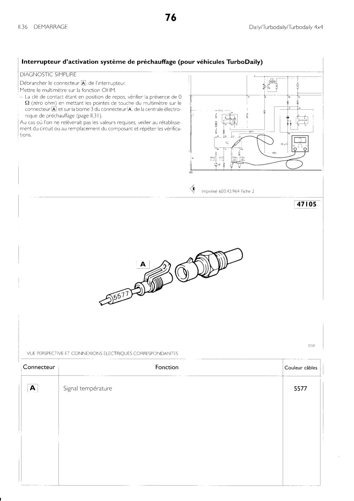 sur mon Iveco 35-12 4*2, en 2.5l de 1991, le boitier vers la boite à gant sert au préchauffage, qui est composé d'une bougie flamstart sur la tubulure d'admission et d'une électrovanne qui laisse couler du gasoil sur ladite bougie.