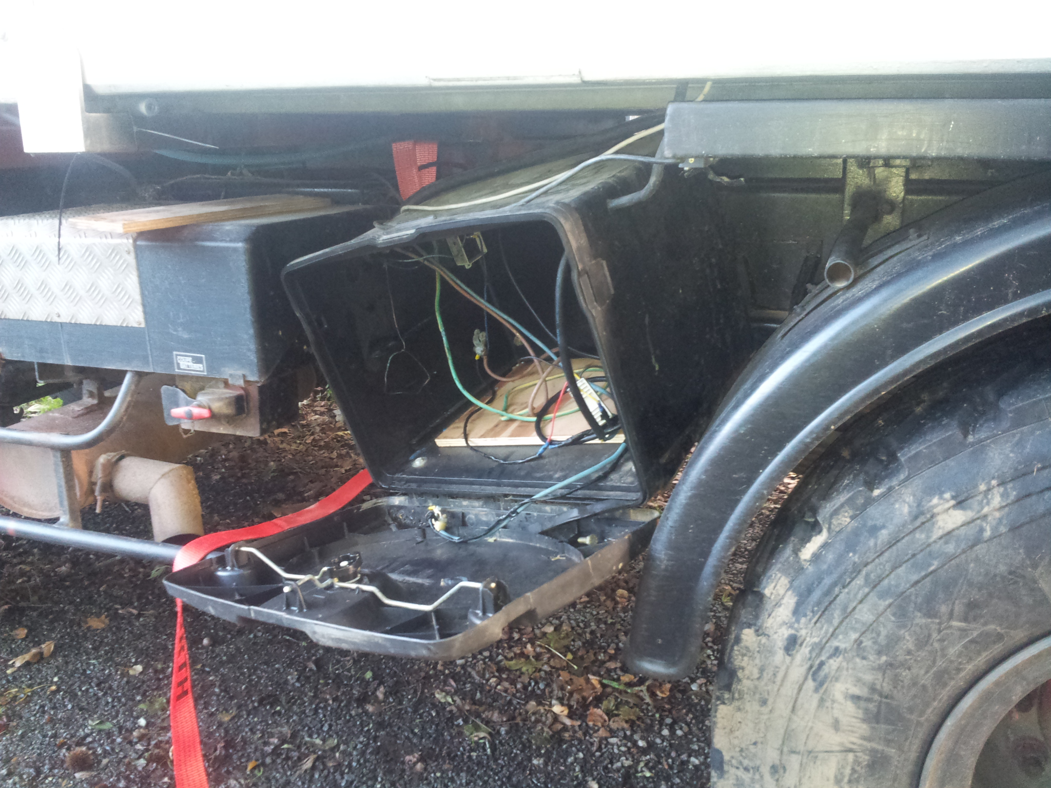 le shelter est posé sur l'ancien faux châssis pompier, l'avant boulonné par une traverse à celui-ci et à l'arrière, une traverse soudée au shelter vient se boulonner au cul du châssis