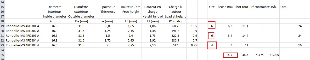 Puis on effectue un serrage de précontrainte qui représente 15% de la résistance max obtenue ou par la somme de la valeur de flexion en mm de chaque rondelles à 15% de contrainte.
