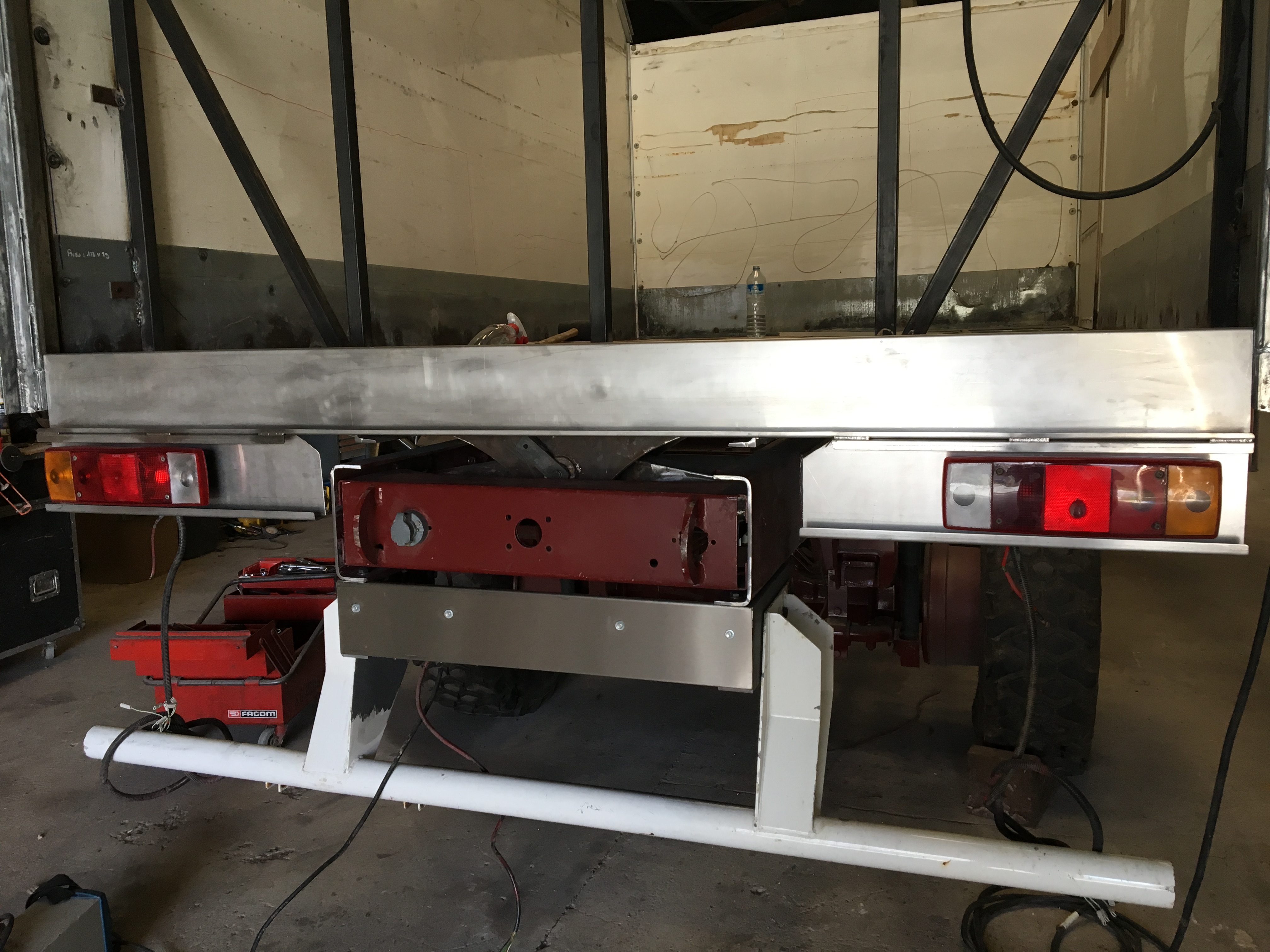 Montage à blanc de l'habillage arrière inox, positionnement des feux , barre anti encastrement (sera relevable) ,châssis roues de secours et cornières cellule.