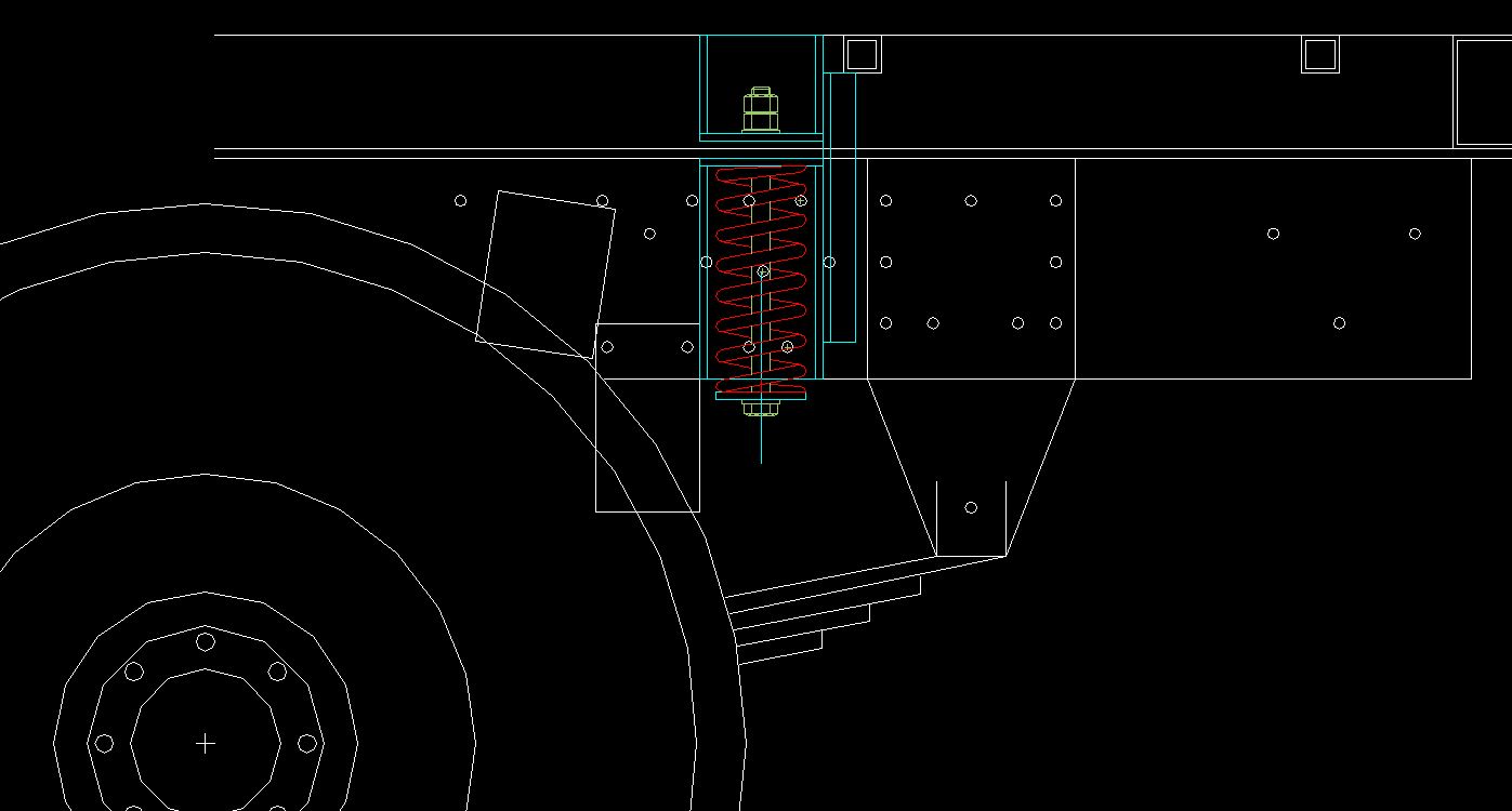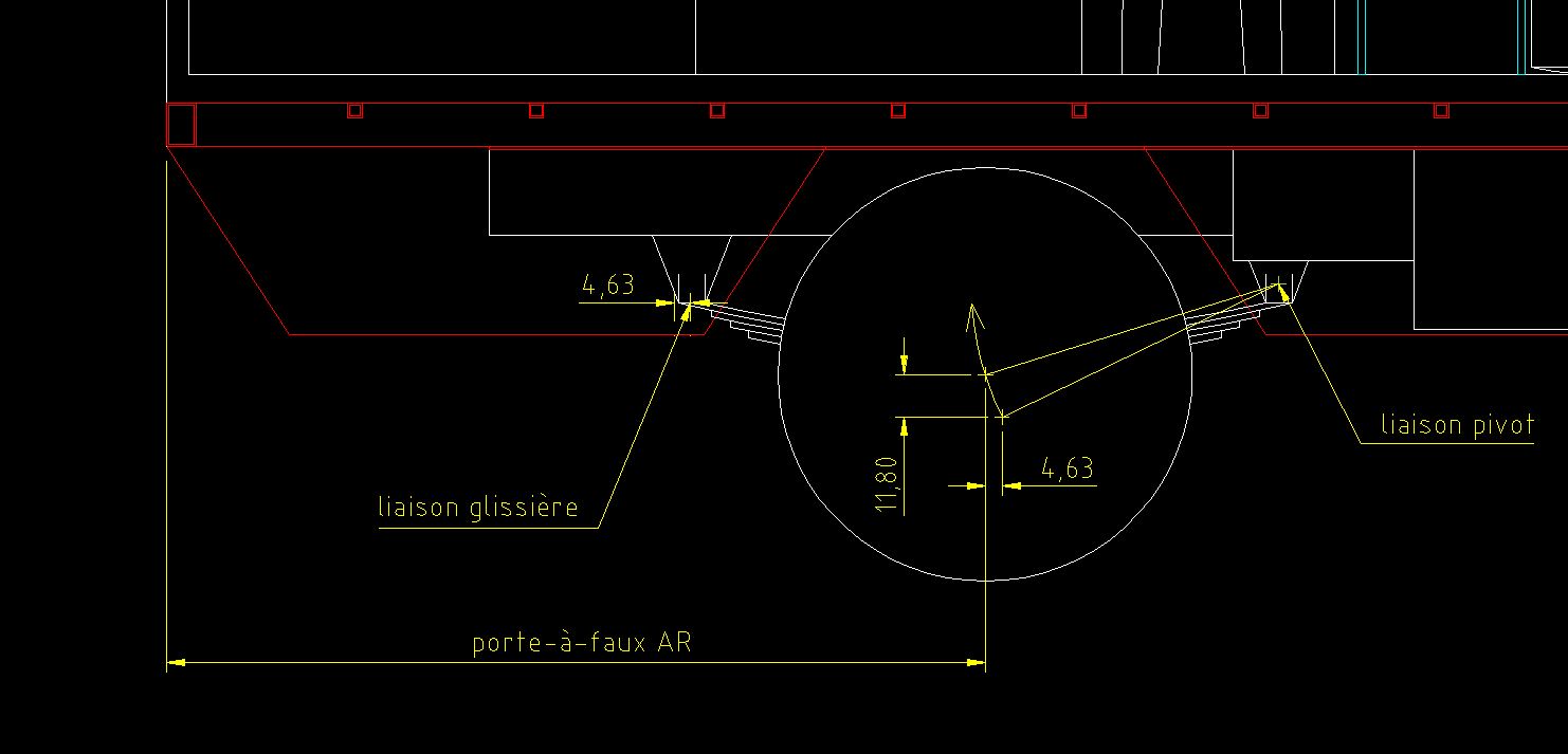 J'ai une mesure à vide et à plat : 180mm entre le dessous des 2 tampons élastomère et les surfaces d'appui correspondantes sur les ponts. Cette mesure permet de montrer que sur sol plat, à l'arrêt, châssis totalement écrasé par une potentielle surcharge statique, le point haut de mes roues AR ne dépassera pas 14mm au dessus du plan formé par les faces supérieures des longerons du châssis 234x70.