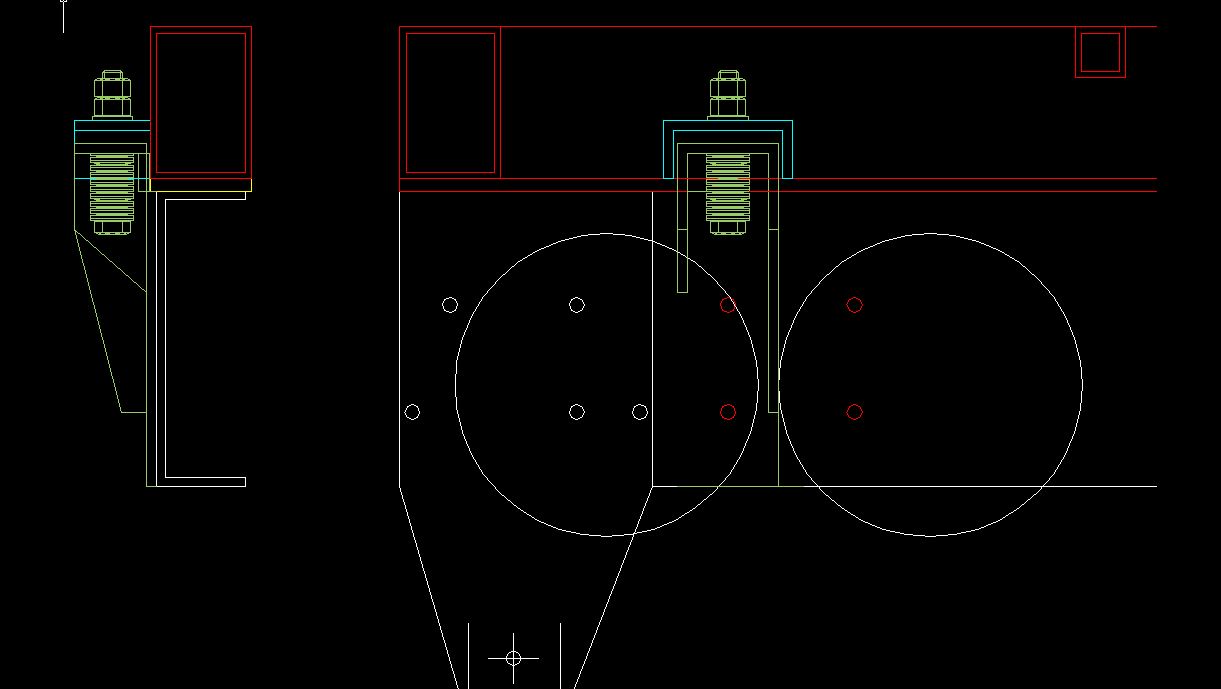 En bleu, j'ai prévu aussi deux guides latéraux qui permettront, en sortie de croisement de pont, le retour du faux châssis sur le châssis dans sa position initiale, qui fait aussi office de butée longitudinale vers l'avant du véhicule.