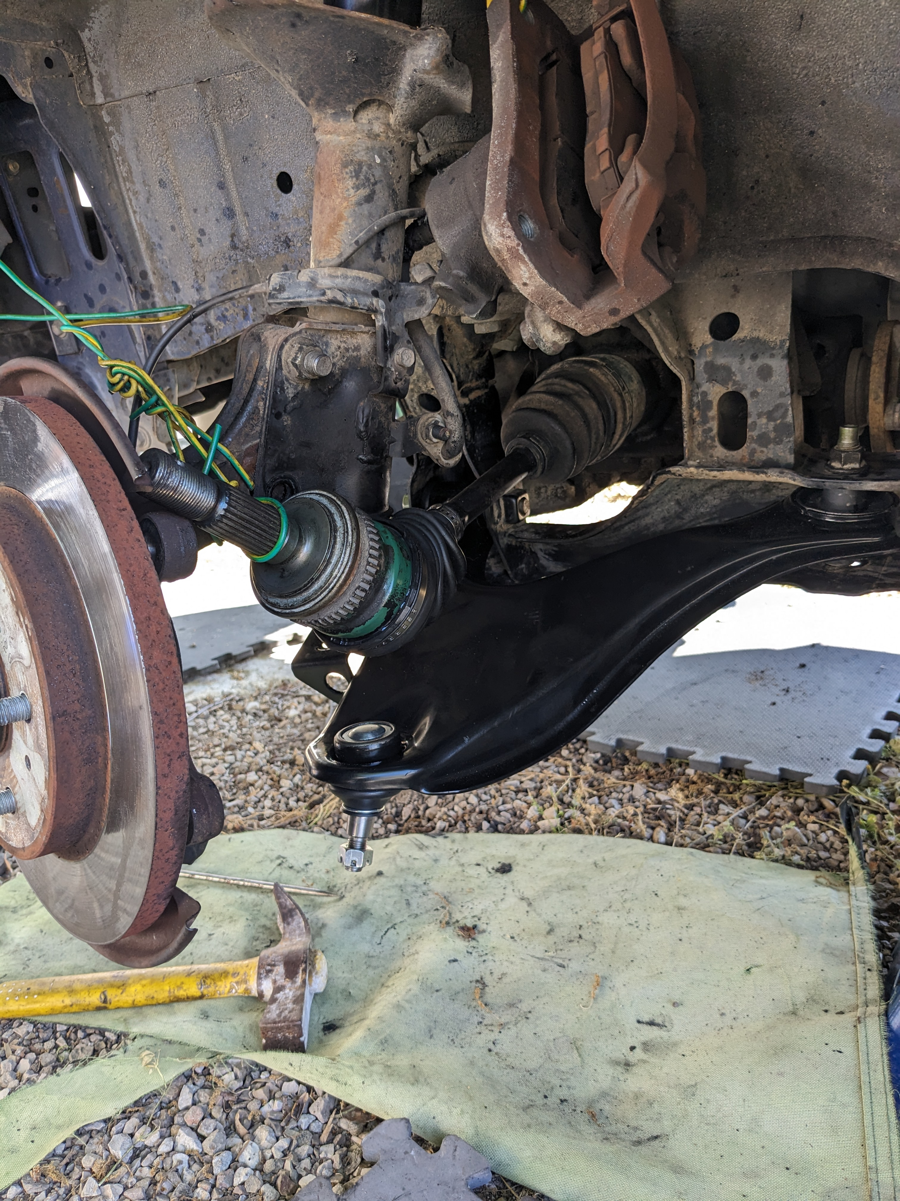 Pousse le joint vers le haut pour te gagner de la tige fileté et si vraiment tu y arrives pas en levant le triangle avec un cric, remet ta roue et pose ton véhicule, ça va te réaxer ton support de moyeu puis tu pourras mettre l'écrou (l'écrou se serre au pétard pour éviter que l'axe tourne au départ)